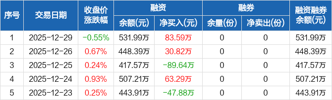 融資方面,當(dāng)日融資買入254.61萬(wàn)元,融資償還171.01萬(wàn)元,融資凈買入83.59萬(wàn)元。融券方面,融券賣出0份,融券償還0份,融券余量0份,融券余額0元。融資融券余額合計(jì)531.99萬(wàn)元。