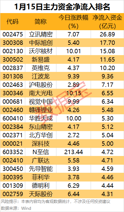 消費(fèi)電子龍頭股立訊精密主力資金凈流入居首,達(dá)26.89億元,股價(jià)上漲7.07%。