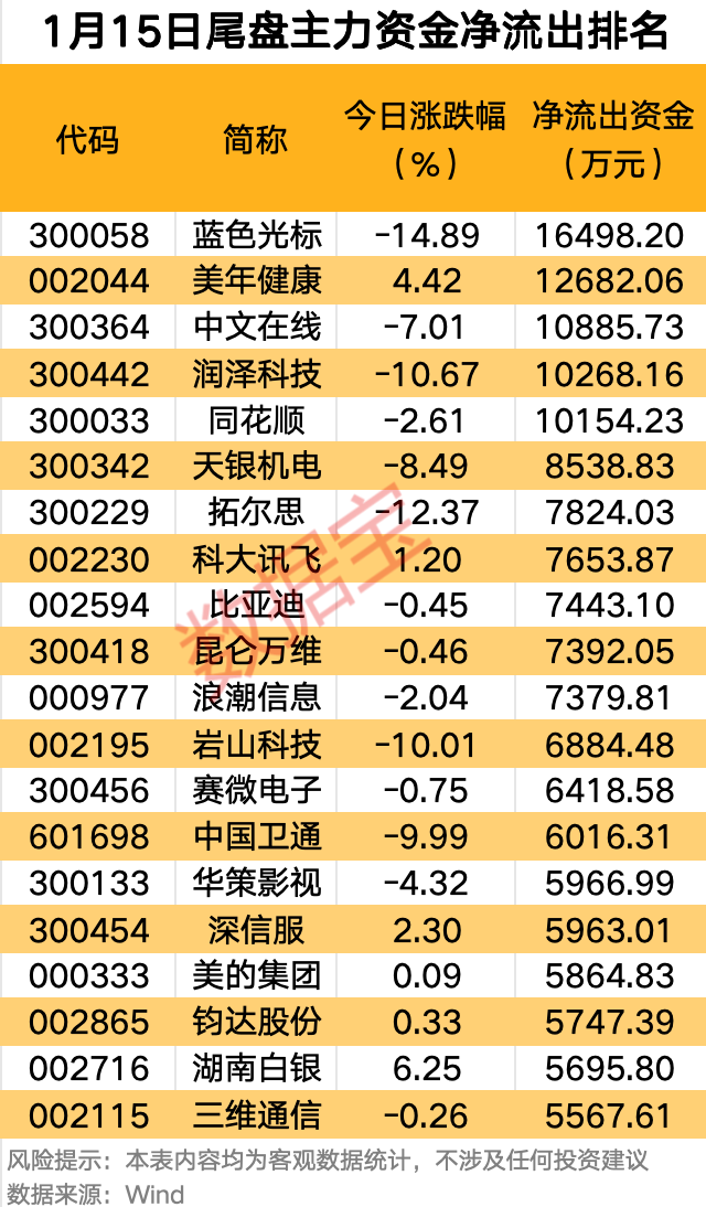此外,還有美年健康、中文在線、潤(rùn)澤科技、同花順和天銀機(jī)電等尾盤(pán)主力資金凈流出金額居前。
