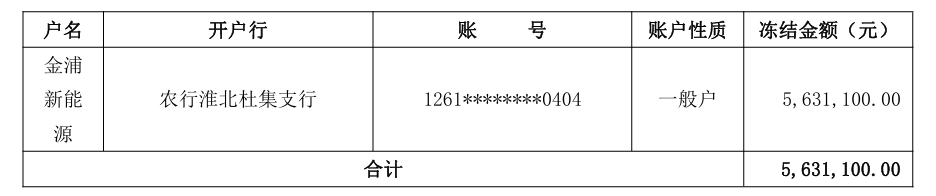 1月15日晚間,金浦鈦業(yè)(000545)公告稱,公司近日獲悉,控股子公司安徽金浦新能源科技發(fā)展有限公司(以下簡(jiǎn)稱“金浦新能源”)部分銀行賬戶資金被凍結(jié),凍結(jié)金額563.11萬(wàn)元。