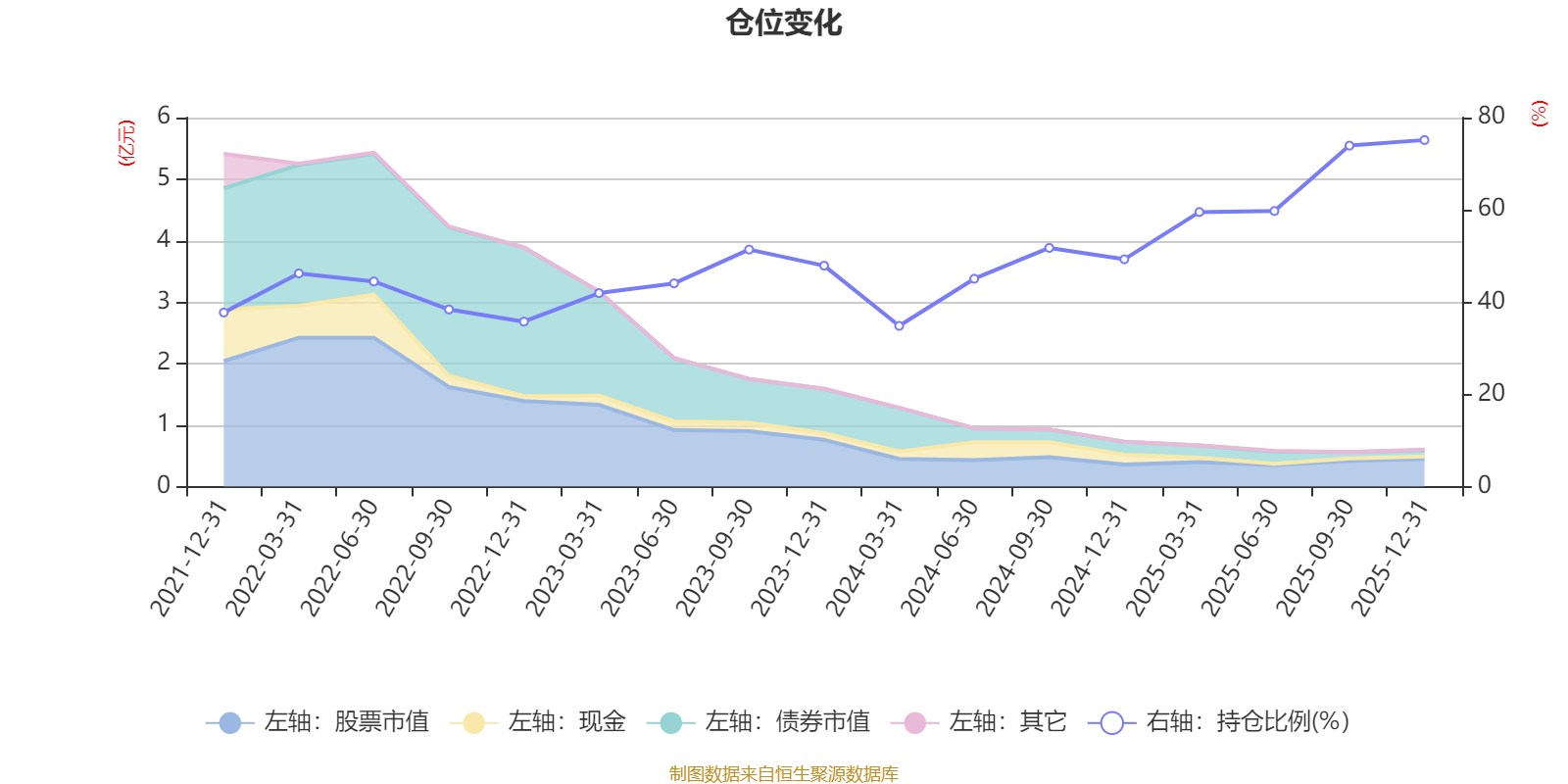 據(jù)定期報(bào)告數(shù)據(jù)統(tǒng)計(jì),近三年平均股票倉(cāng)位為52.88%,同類(lèi)平均為72.46%。2025年末基金達(dá)到75.14%的最高倉(cāng)位,2024年一季度末最低,為34.84%。