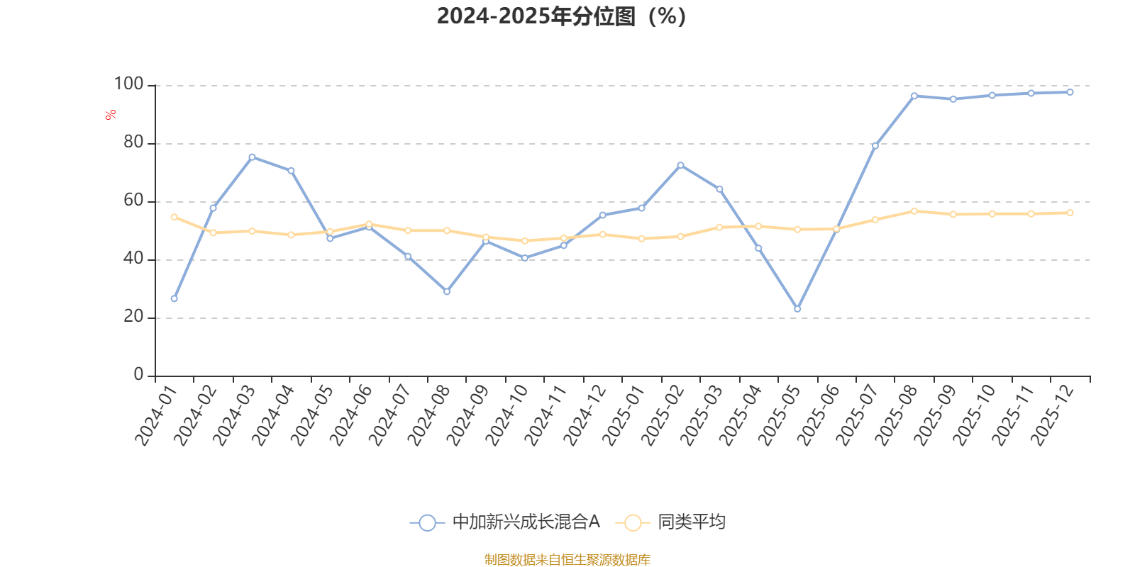 通過所選區(qū)間該基金凈值增長率分位圖,可以觀察該基金與同類基金業(yè)績比較情況。圖為坐標(biāo)原點(diǎn)到區(qū)間內(nèi)某時點(diǎn)的凈值增長率在同類基金中的分位數(shù)。