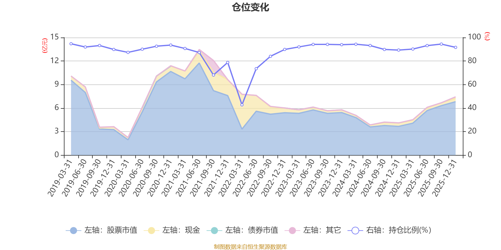 據(jù)定期報(bào)告數(shù)據(jù)統(tǒng)計(jì),近三年平均股票倉位為92.51%,同類平均為72.46%。2019年一季度末基金達(dá)到94.69%的最高倉位,2022年一季度末最低,為42.78%。