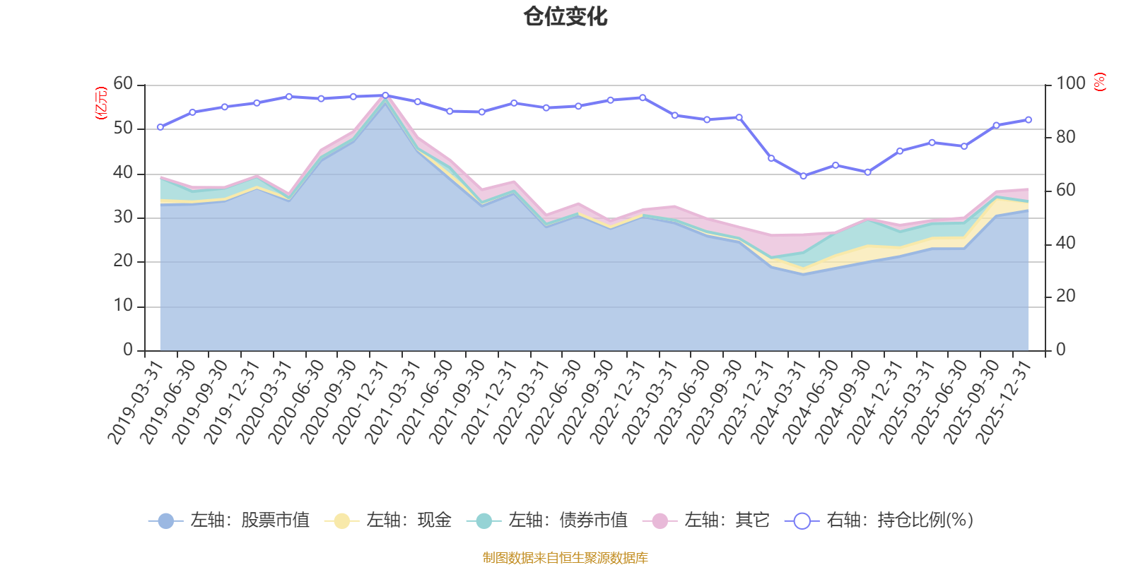 據(jù)定期報(bào)告數(shù)據(jù)統(tǒng)計(jì),近三年平均股票倉位為78.32%,同類平均為86.13%。2020年末基金達(dá)到96.03%的最高倉位,2024年一季度末最低,為65.69%。