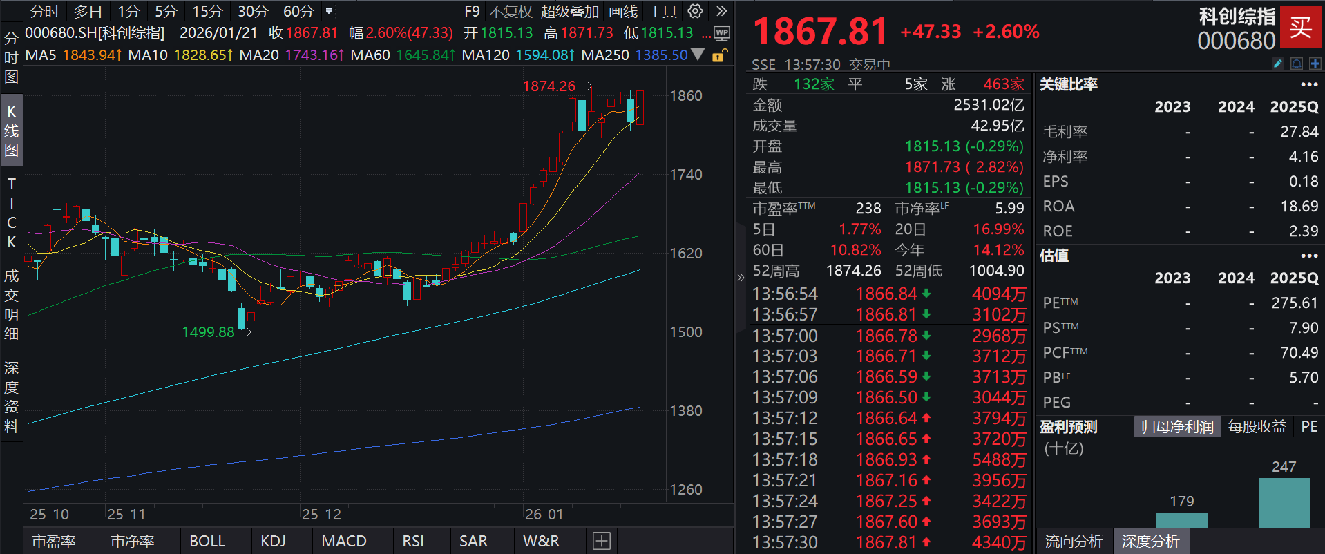 截至2026年1月21日 13:57,科創(chuàng)綜指(000680)強(qiáng)勢(shì)上漲2.60%,成分股龍芯中科(688047)上漲20.00%,芯碁微裝(688630)上漲16.97%,天智航(688277)上漲15.11%,燦芯股份(688691),杰華特(688141)等個(gè)股跟漲。