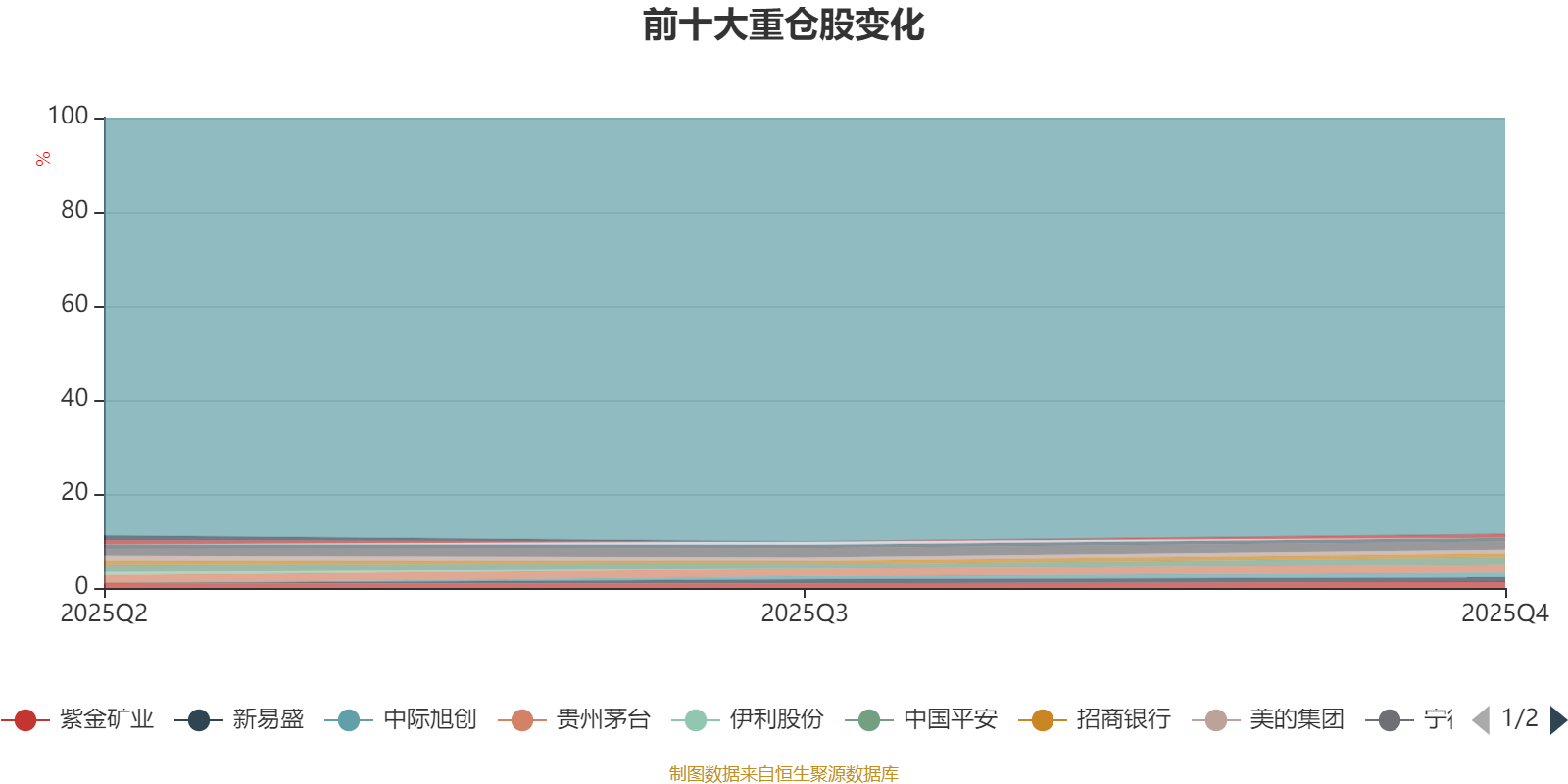 截至2025年四季度末,基金十大重倉股分別是中國平安、寧德時代、貴州茅臺、紫金礦業(yè)、中際旭創(chuàng)、新易盛、招商銀行、美的集團(tuán)、興業(yè)銀行、中信證券。