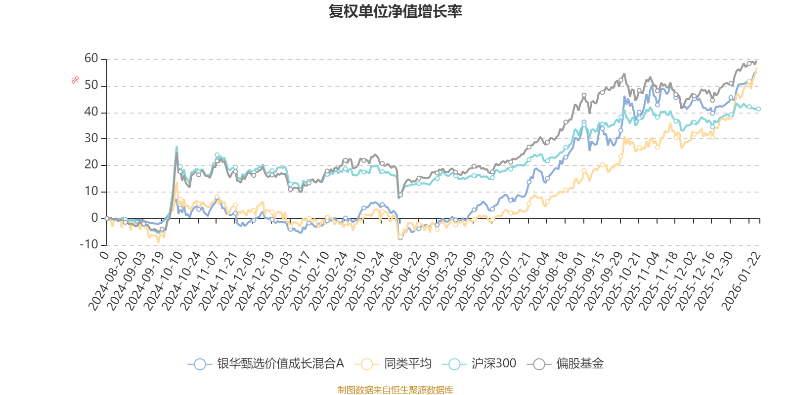 截至1月21日,銀華甄選價值成長混合A近三個月復(fù)權(quán)單位凈值增長率為10.54%,位于同類可比基金38/49;近半年復(fù)權(quán)單位凈值增長率為36.12%,位于同類可比基金30/49;近一年復(fù)權(quán)單位凈值增長率為58.25%,位于同類可比基金26/46。