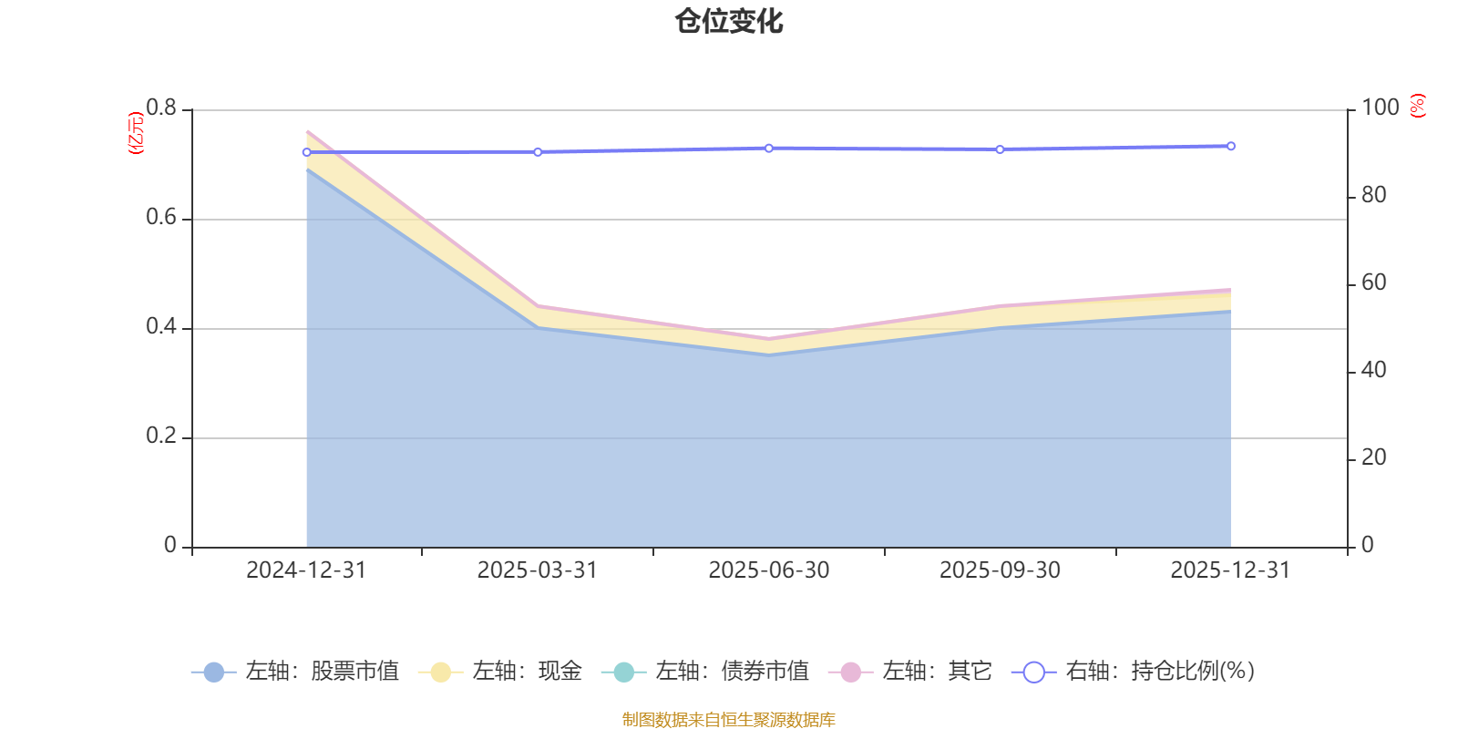 據(jù)定期報告數(shù)據(jù)統(tǒng)計,基金股票倉位長期保持較高水平,成立以來平均股票倉位為90.8%,同類平均為86.41%。2025年末基金達到91.61%的最高倉位,2024年末最低,為90.2%。