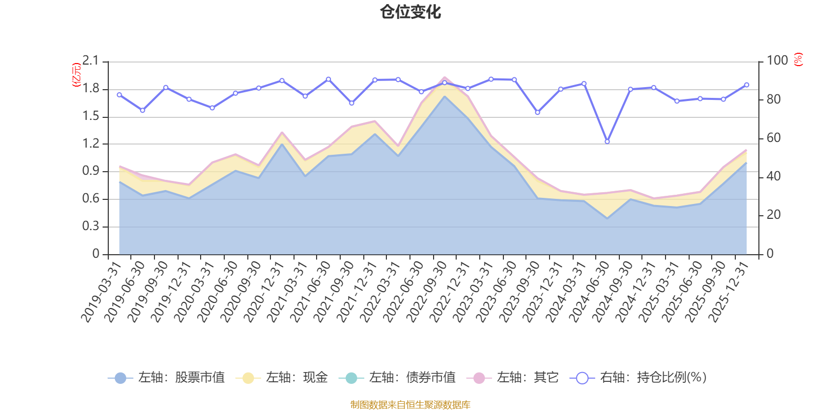 據(jù)定期報(bào)告數(shù)據(jù)統(tǒng)計(jì),近三年平均股票倉位為82.37%,同類平均為72.57%。2023年一季度末基金達(dá)到90.83%的最高倉位,2024年上半年末最低,為58.51%。