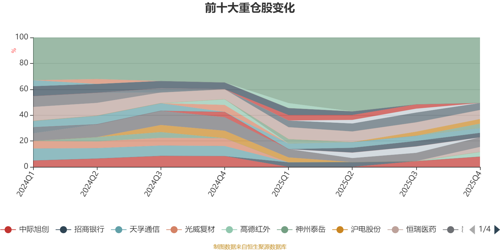 截至2025年四季度末,基金十大重倉(cāng)股分別是中際旭創(chuàng)、新易盛、貴州茅臺(tái)、愷英網(wǎng)絡(luò)、恒瑞醫(yī)藥、溫氏股份、高德紅外、大金重工、金山辦公、萬(wàn)華化學(xué)。