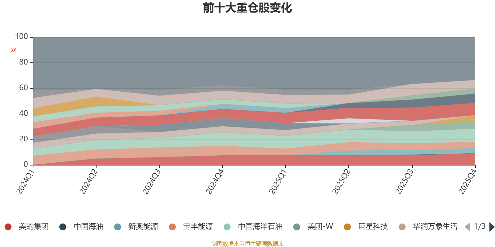 該基金持股集中度較高。截至2025年四季度末,基金重倉股分別是中國海洋石油、騰訊控股、美的集團(tuán)、紫金礦業(yè)、貴州茅臺、美團(tuán)-W、巨星科技、寶豐能源、新奧能源、亞鉀國際、中國海油。