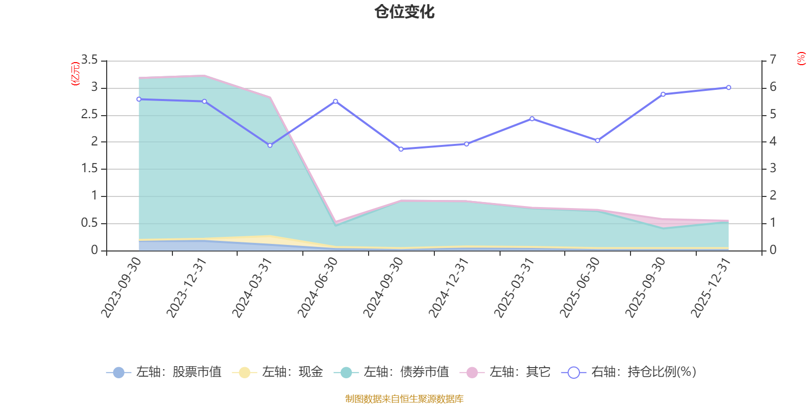 據(jù)定期報(bào)告數(shù)據(jù)統(tǒng)計(jì),成立以來(lái)平均股票倉(cāng)位為4.88%,同類平均為19.2%。2025年末基金達(dá)到6.01%的最高倉(cāng)位,2024年三季度末最低,為3.74%。