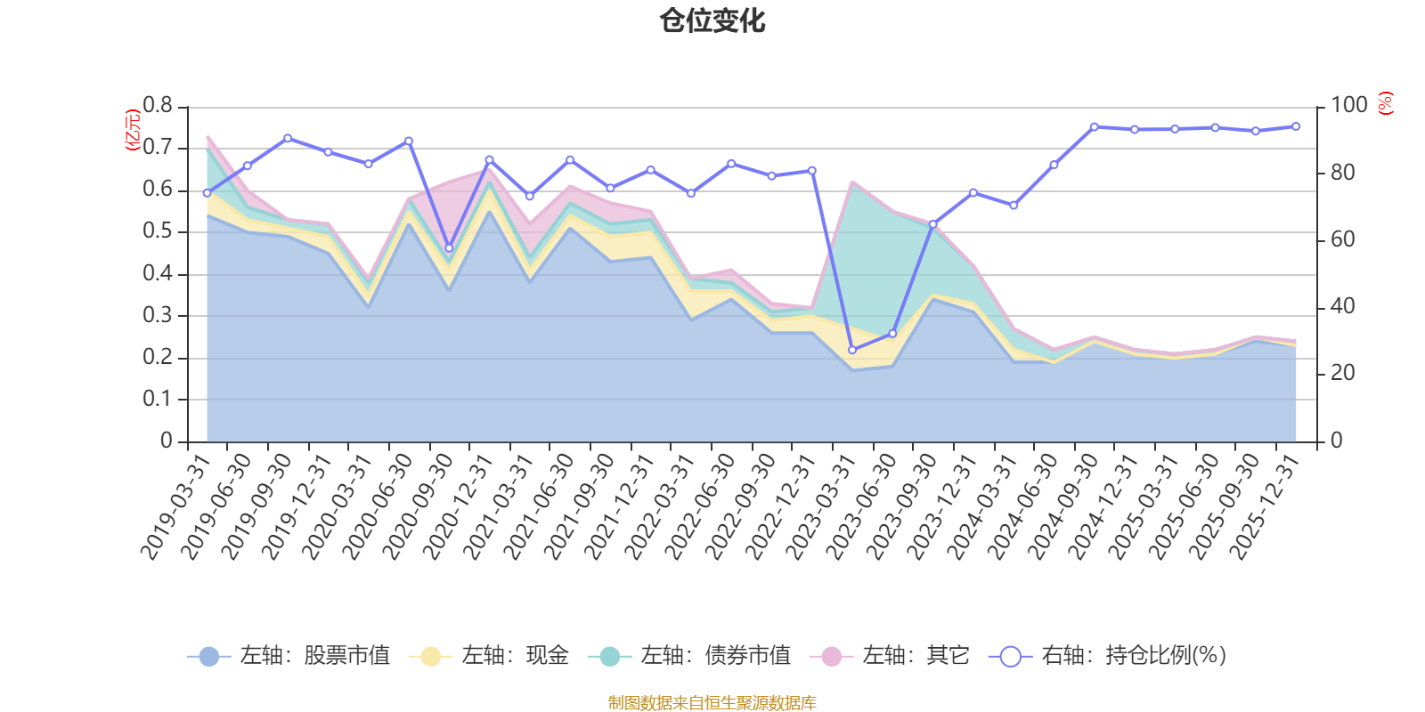 據(jù)定期報告數(shù)據(jù)統(tǒng)計,近三年平均股票倉位為76.15%,同類平均為72.57%。2025年末基金達到94.16%的最高倉位,2023年一季度末最低,為27.43%。