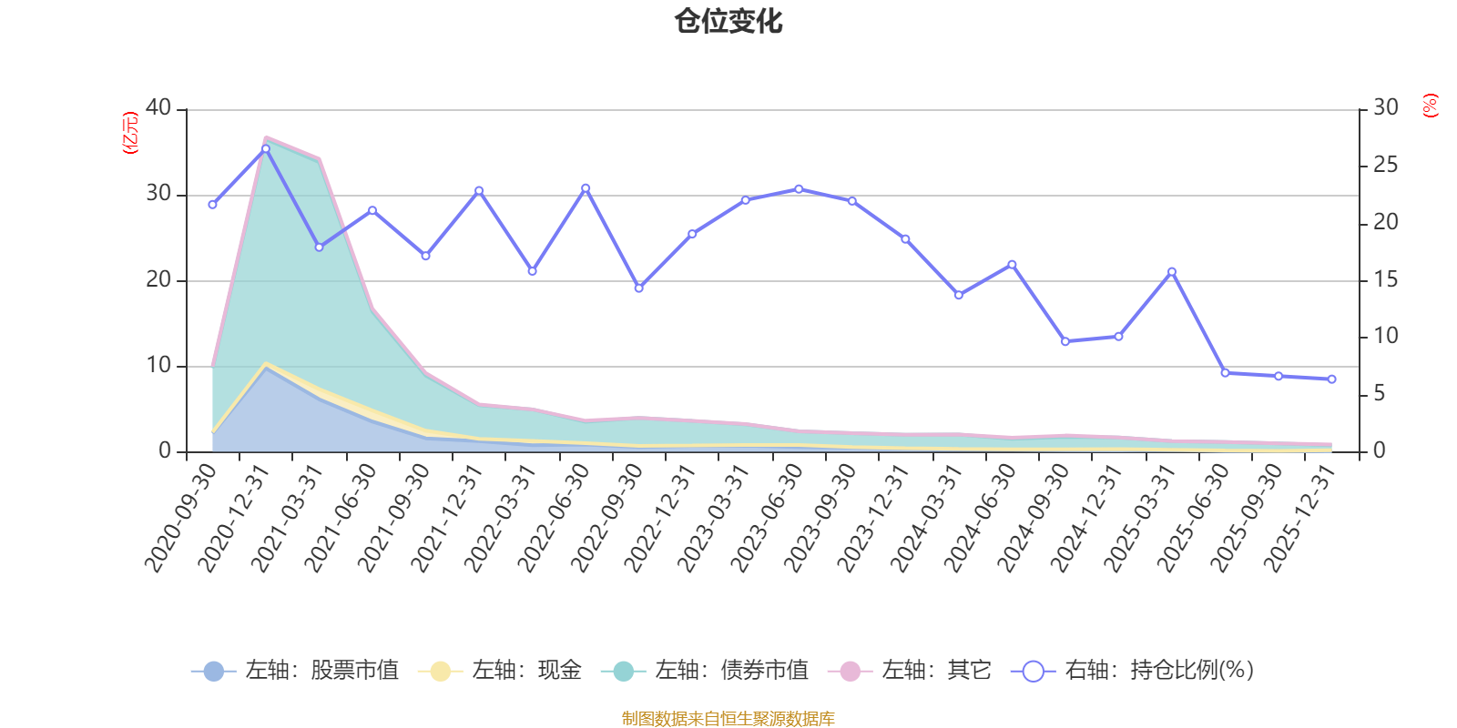 據(jù)定期報(bào)告數(shù)據(jù)統(tǒng)計(jì),近三年平均股票倉(cāng)位為14.27%,同類平均為19.2%。2020年末基金達(dá)到26.54%的最高倉(cāng)位,2025年末最低,為6.36%。