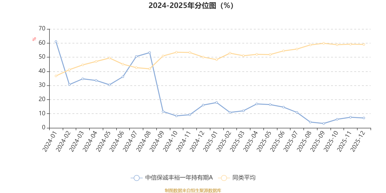 通過所選區(qū)間該基金凈值增長率分位圖,可以觀察該基金與同類基金業(yè)績比較情況。圖為坐標(biāo)原點(diǎn)到區(qū)間內(nèi)某時(shí)點(diǎn)的凈值增長率在同類基金中的分位數(shù)。