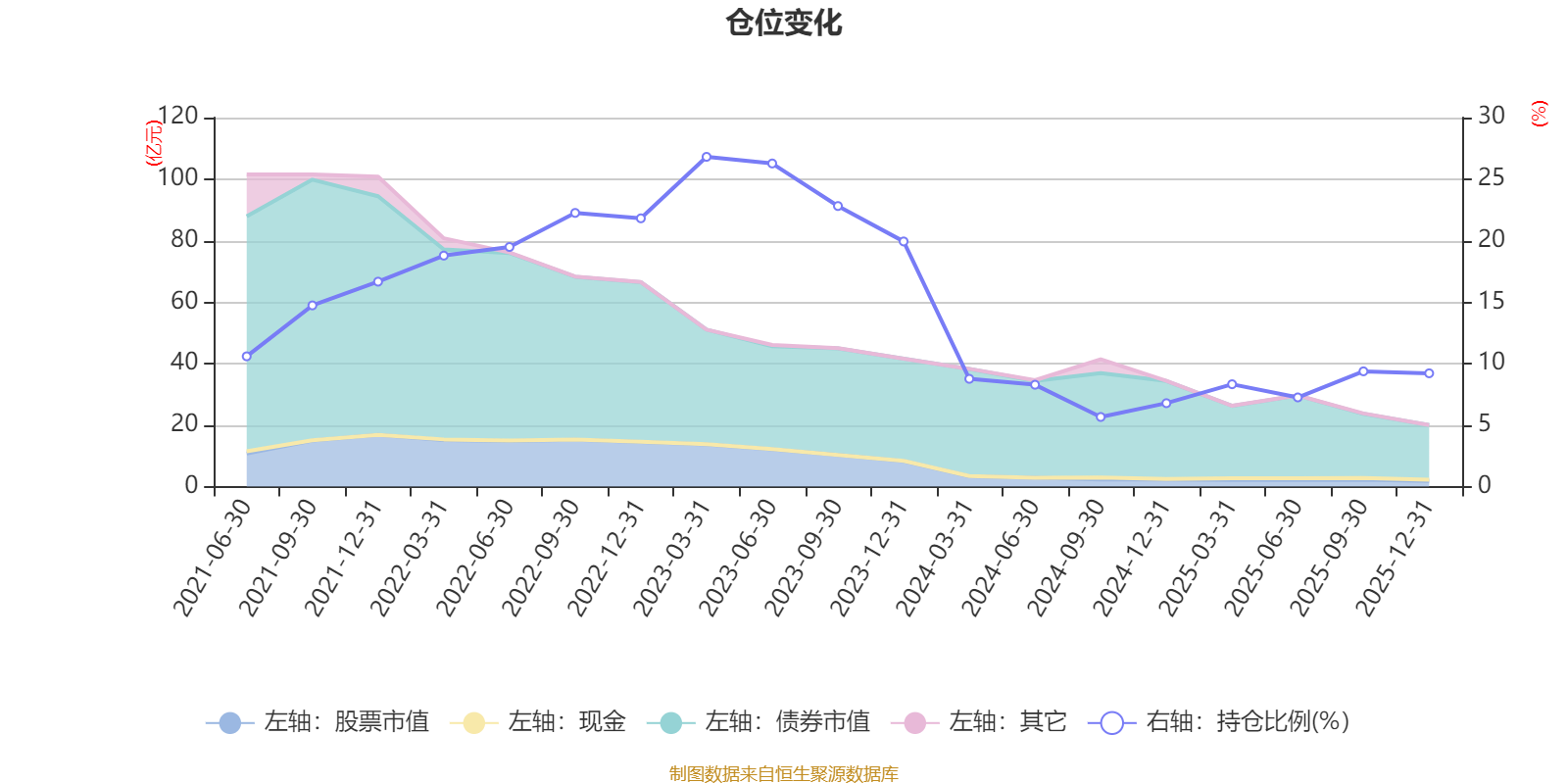 據(jù)定期報(bào)告數(shù)據(jù)統(tǒng)計(jì),近三年平均股票倉位為13.29%,同類平均為19.2%。2023年一季度末基金達(dá)到26.81%的最高倉位,2024年三季度末最低,為5.66%。