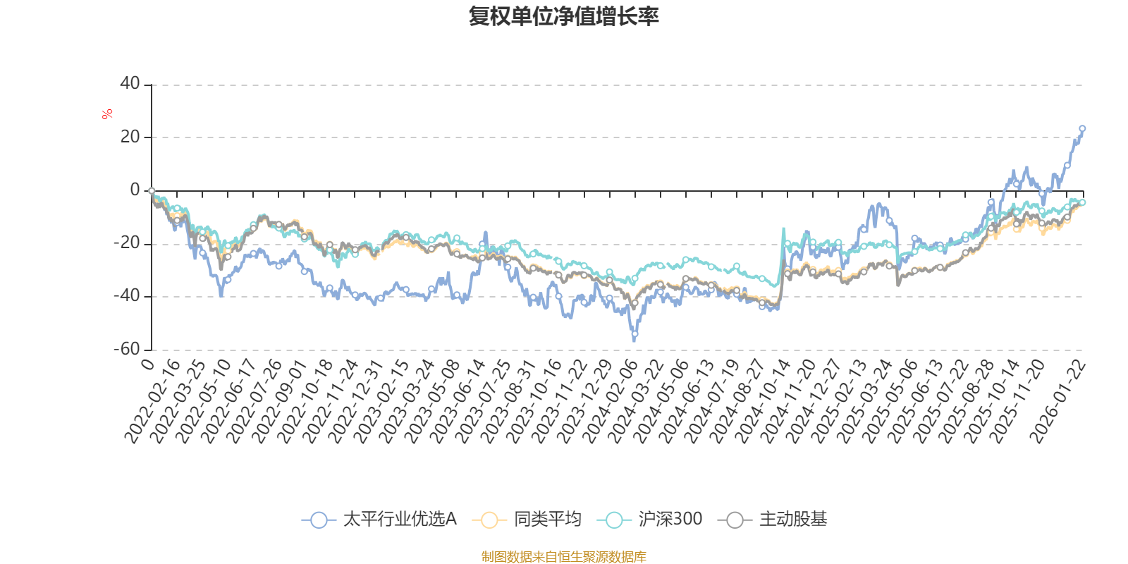 截至1月22日,太平行業(yè)優(yōu)選A近三個月復(fù)權(quán)單位凈值增長率為19.06%,位于同類可比基金16/121;近半年復(fù)權(quán)單位凈值增長率為51.04%,位于同類可比基金13/121;近一年復(fù)權(quán)單位凈值增長率為57.09%,位于同類可比基金21/119;近三年復(fù)權(quán)單位凈值增長率為94.97%,位于同類可比基金2/89。