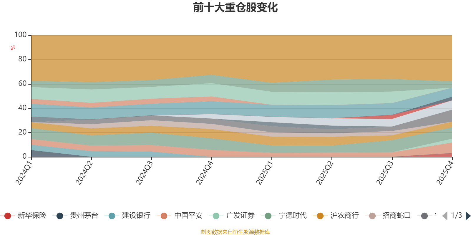 該基金持股集中度較高,近2年前十大重倉(cāng)股集中度長(zhǎng)期超過(guò)60%。截至2025年四季度末,基金十大重倉(cāng)股分別是寧波銀行、寧德時(shí)代、中國(guó)平安、中國(guó)太保、江蘇銀行、杭州銀行、滬農(nóng)商行、廣發(fā)證券、新華保險(xiǎn)、三花智控。