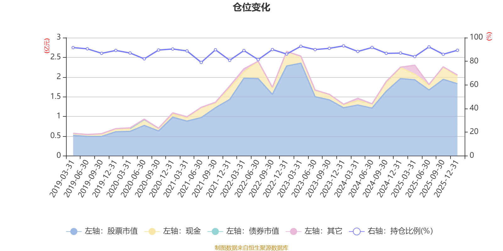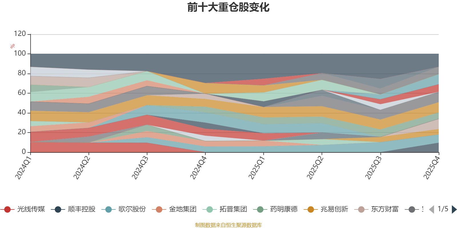 該基金持股集中度較高,近2年前十大重倉(cāng)股集中度長(zhǎng)期超過(guò)60%。截至2025年四季度末,基金十大重倉(cāng)股分別是陽(yáng)光電源、東方財(cái)富、萬(wàn)華化學(xué)、立訊精密、順豐控股、歌爾股份、中國(guó)東航、中國(guó)國(guó)航、華新建材、兆易創(chuàng)新。