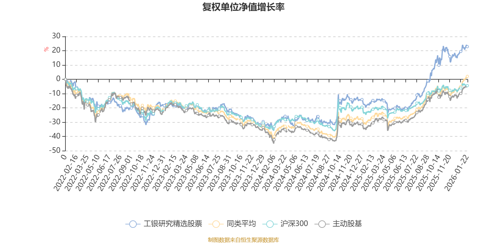 截至1月22日,工銀研究精選股票近三個(gè)月復(fù)權(quán)單位凈值增長(zhǎng)率為8.25%,位于同類可比基金106/167;近半年復(fù)權(quán)單位凈值增長(zhǎng)率為38.10%,位于同類可比基金47/167;近一年復(fù)權(quán)單位凈值增長(zhǎng)率為50.00%,位于同類可比基金59/165;近三年復(fù)權(quán)單位凈值增長(zhǎng)率為46.81%,位于同類可比基金23/156。
