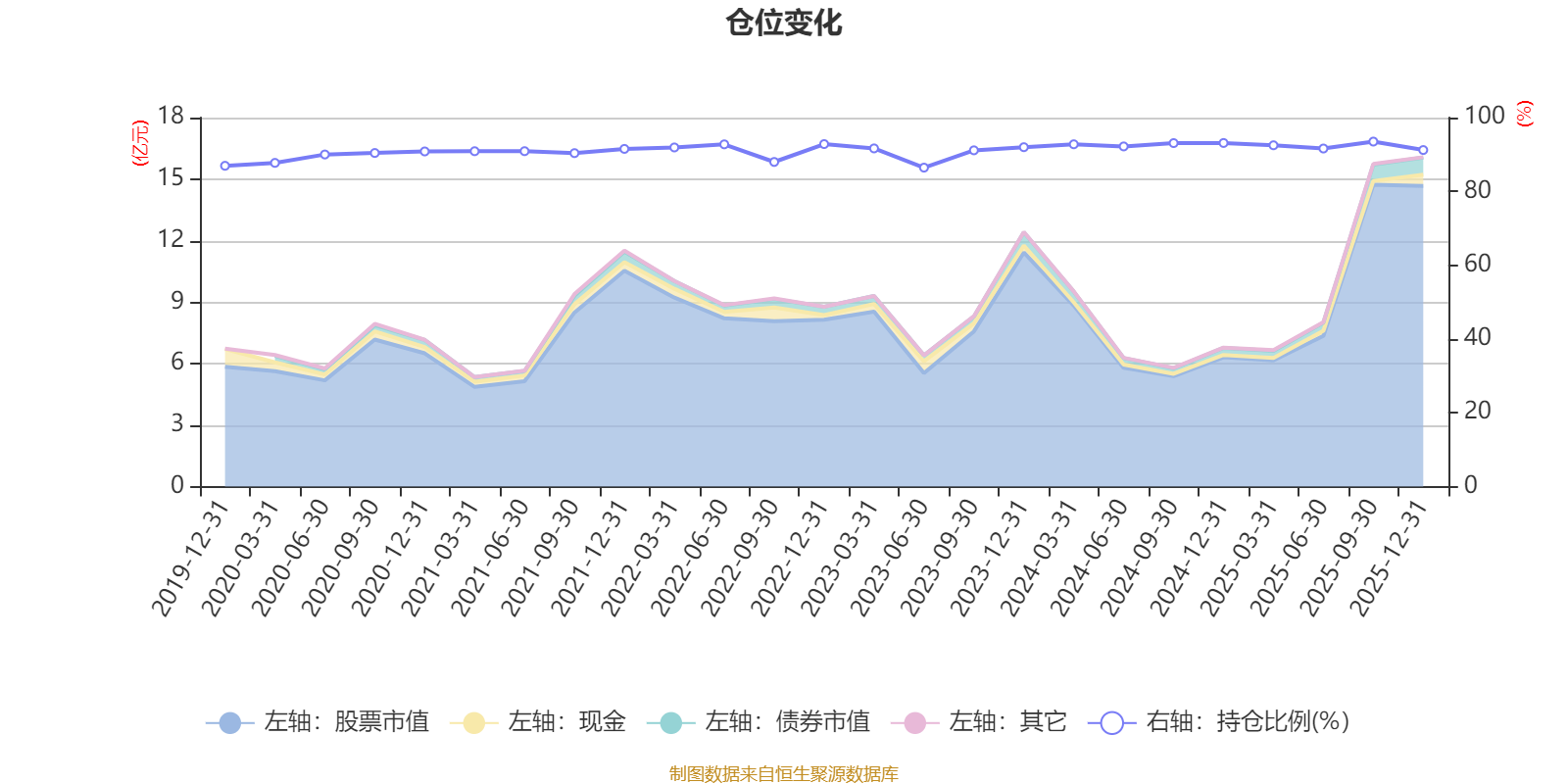 據(jù)定期報告數(shù)據(jù)統(tǒng)計,近三年平均股票倉位為91.77%,同類平均為88.27%。2025年三季度末基金達到93.5%的最高倉位,2023年上半年末最低,為86.44%。