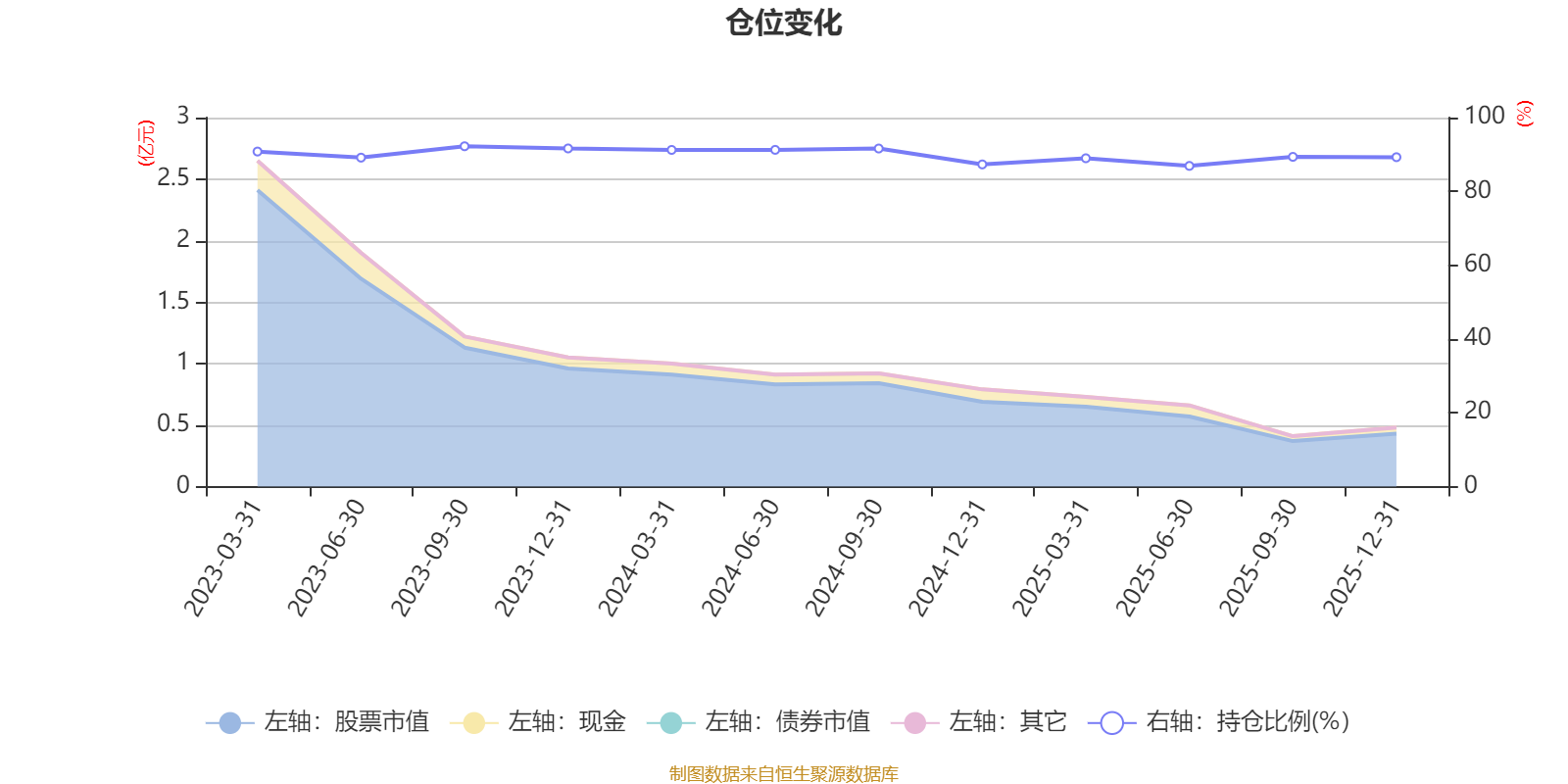 據(jù)定期報(bào)告數(shù)據(jù)統(tǒng)計(jì),近三年平均股票倉位為89.98%,同類平均為88.34%。2023年三季度末基金達(dá)到92.23%的最高倉位,2025年上半年末最低,為86.91%。