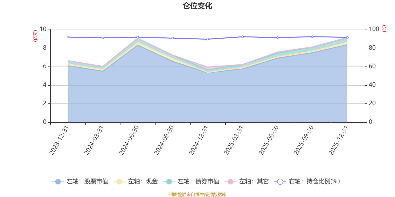 據(jù)定期報(bào)告數(shù)據(jù)統(tǒng)計(jì),成立以來(lái)平均股票倉(cāng)位為91.39%,同類平均為88.27%。2025年三季度末基金達(dá)到92.29%的最高倉(cāng)位,2024年末最低,為89.6%。