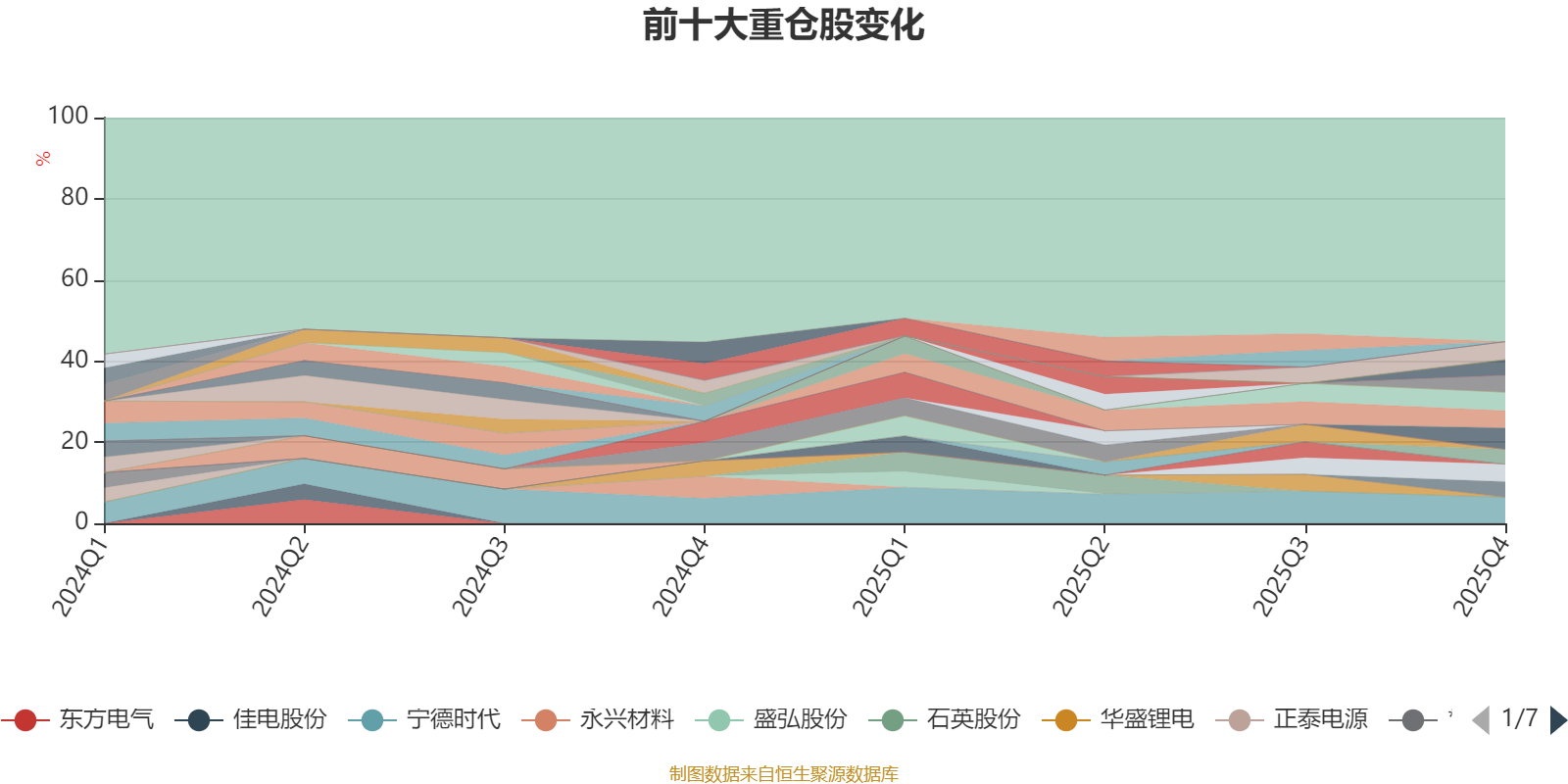截至2025年四季度末,基金十大重倉(cāng)股分別是寧德時(shí)代、科達(dá)利、珠海冠宇、廈鎢新能、中一科技、陽(yáng)光電源、新益昌、天賜材料、鵬輝能源、嘉元科技。