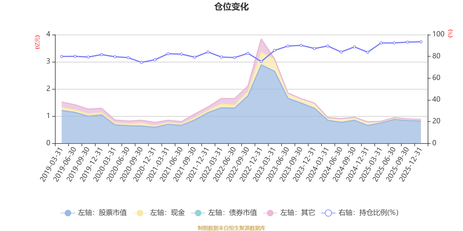 據(jù)定期報告數(shù)據(jù)統(tǒng)計,近三年平均股票倉位為89.17%,同類平均為88.34%。2025年末基金達到93.43%的最高倉位,2020年三季度末最低,為74.49%。