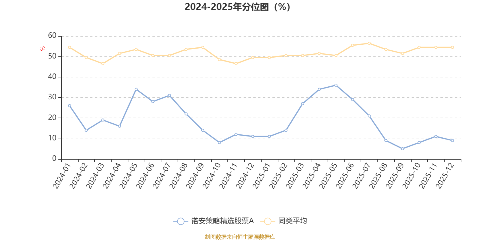通過所選區(qū)間該基金凈值增長率分位圖,可以觀察該基金與同類基金業(yè)績比較情況。圖為坐標原點到區(qū)間內某時點的凈值增長率在同類基金中的分位數(shù)。