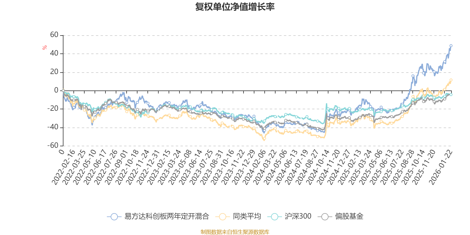 截至1月22日,易方達(dá)科創(chuàng)板兩年定開混合近三個(gè)月復(fù)權(quán)單位凈值增長(zhǎng)率為23.32%,位于同類可比基金26/229;近半年復(fù)權(quán)單位凈值增長(zhǎng)率為74.61%,位于同類可比基金30/229;近一年復(fù)權(quán)單位凈值增長(zhǎng)率為85.00%,位于同類可比基金41/222;近三年復(fù)權(quán)單位凈值增長(zhǎng)率為72.25%,位于同類可比基金55/165。