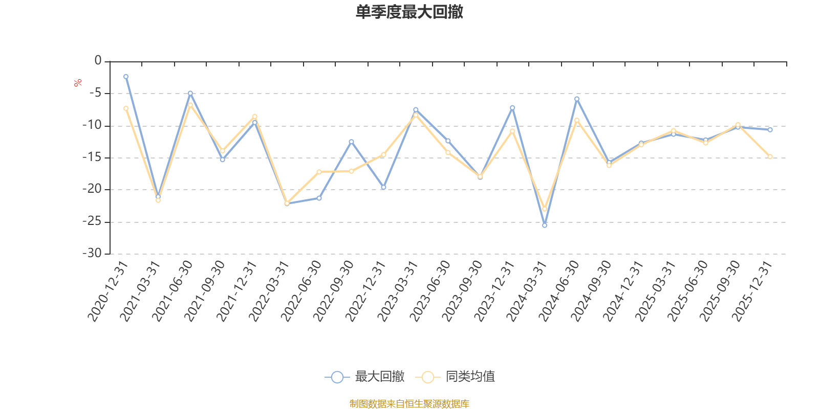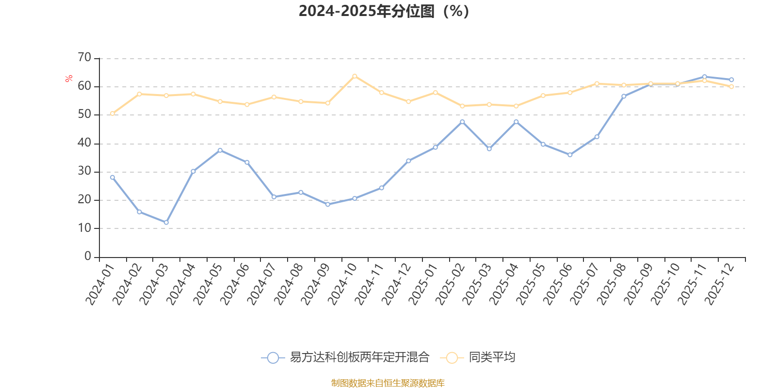 通過所選區(qū)間該基金凈值增長(zhǎng)率分位圖,可以觀察該基金與同類基金業(yè)績(jī)比較情況。圖為坐標(biāo)原點(diǎn)到區(qū)間內(nèi)某時(shí)點(diǎn)的凈值增長(zhǎng)率在同類基金中的分位數(shù)。
