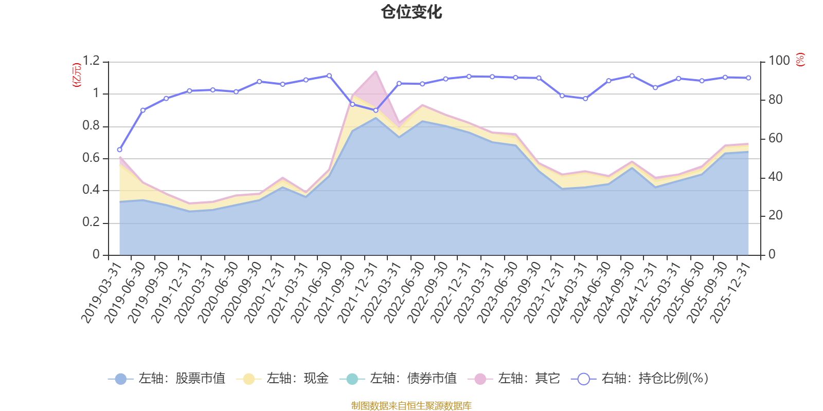 據(jù)定期報(bào)告數(shù)據(jù)統(tǒng)計(jì),近三年平均股票倉位為89.44%,同類平均為72.57%。2021年上半年末基金達(dá)到92.74%的最高倉位,2019年一季度末最低,為54.49%。