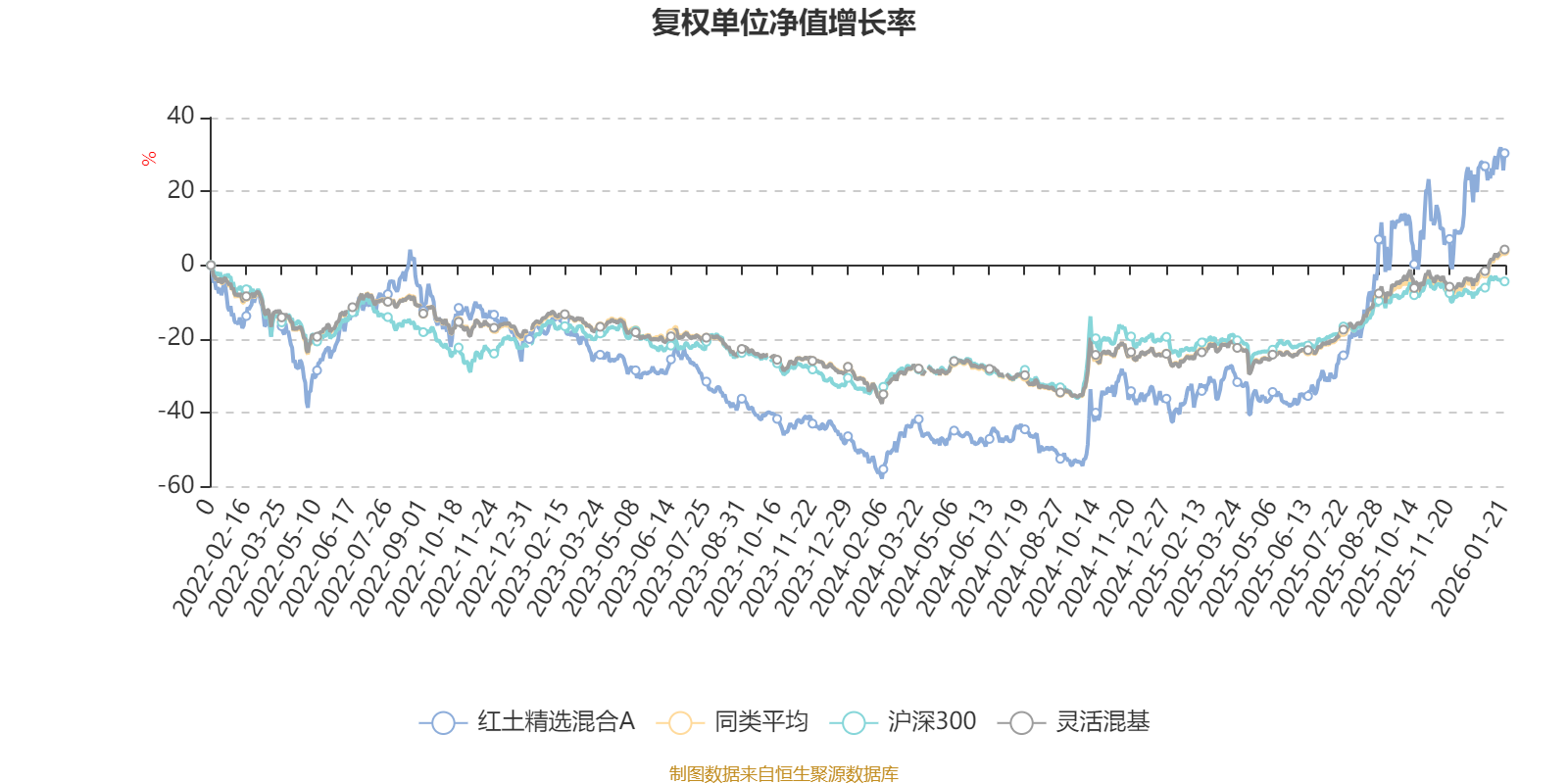 截至1月21日,紅土精選混合A近三個(gè)月復(fù)權(quán)單位凈值增長率為19.41%,位于同類可比基金127/1286;近半年復(fù)權(quán)單位凈值增長率為70.98%,位于同類可比基金33/1286;近一年復(fù)權(quán)單位凈值增長率為97.14%,位于同類可比基金21/1286;近三年復(fù)權(quán)單位凈值增長率為58.71%,位于同類可比基金124/1286。