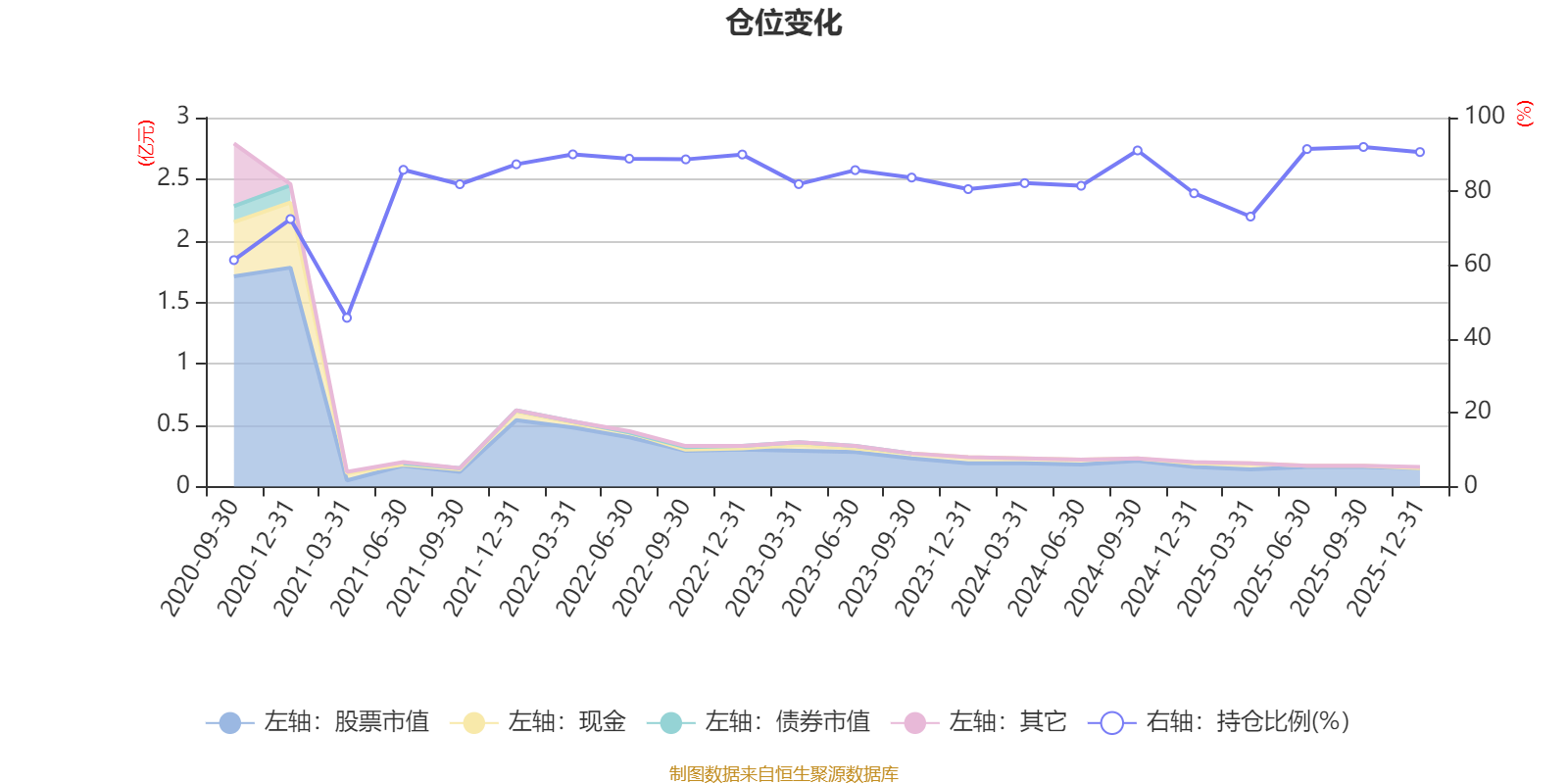 據(jù)定期報(bào)告數(shù)據(jù)統(tǒng)計(jì),近三年平均股票倉位為84.48%,同類平均為84.04%。2025年三季度末基金達(dá)到92.04%的最高倉位,2021年一季度末最低,為45.73%。
