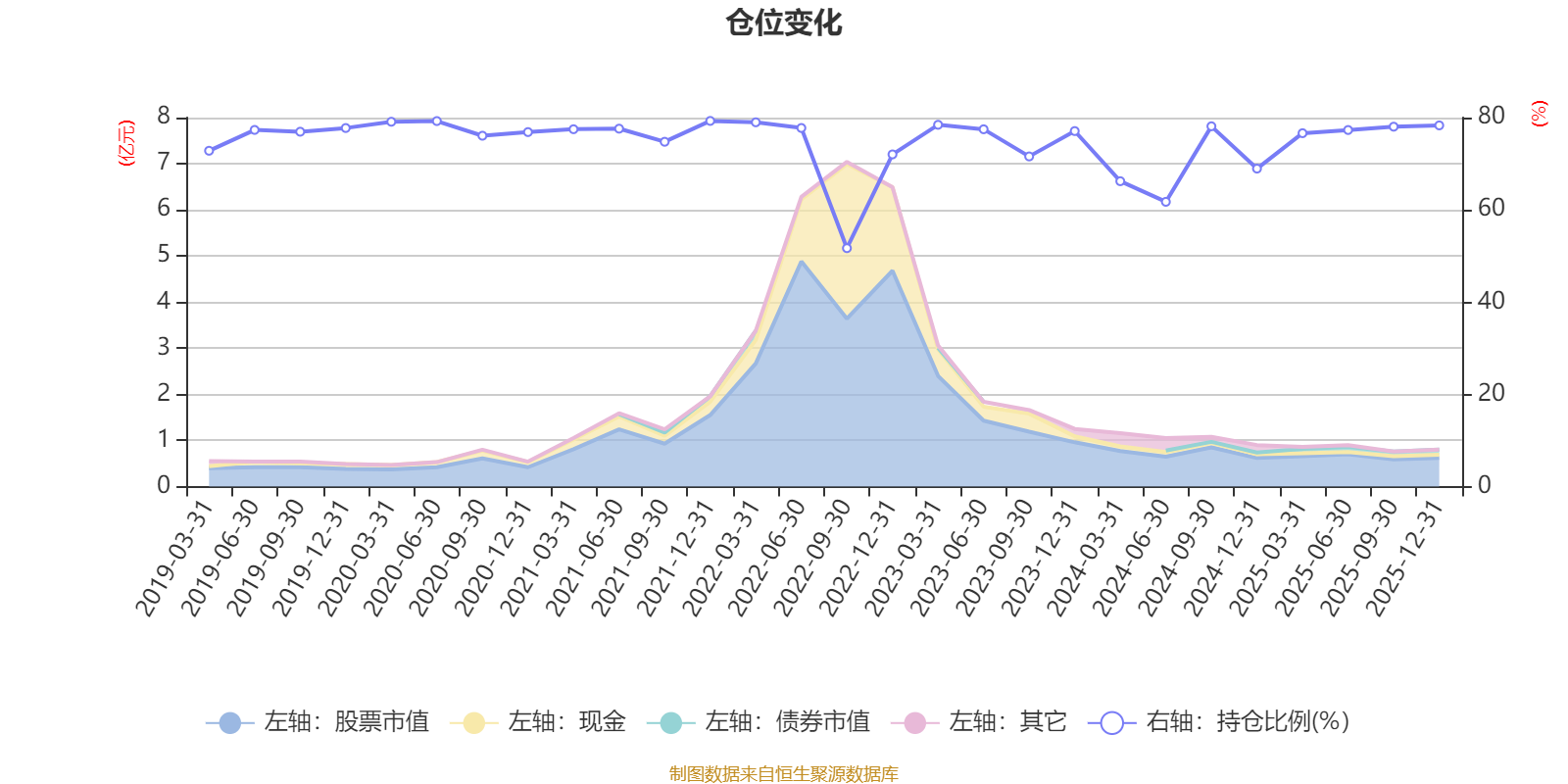 據(jù)定期報告數(shù)據(jù)統(tǒng)計,近三年平均股票倉位為74.15%,同類平均為72.57%。2021年末基金達到79.28%的最高倉位,2022年三季度末最低,為51.69%。