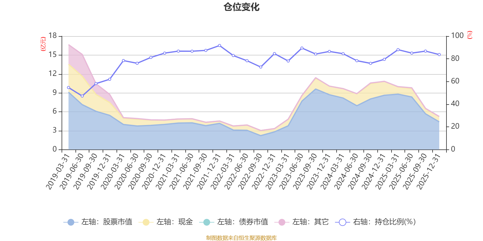 據(jù)定期報(bào)告數(shù)據(jù)統(tǒng)計(jì),近三年平均股票倉(cāng)位為83.38%,同類平均為86.12%。2021年末基金達(dá)到91.75%的最高倉(cāng)位,2019年上半年末最低,為47.22%。
