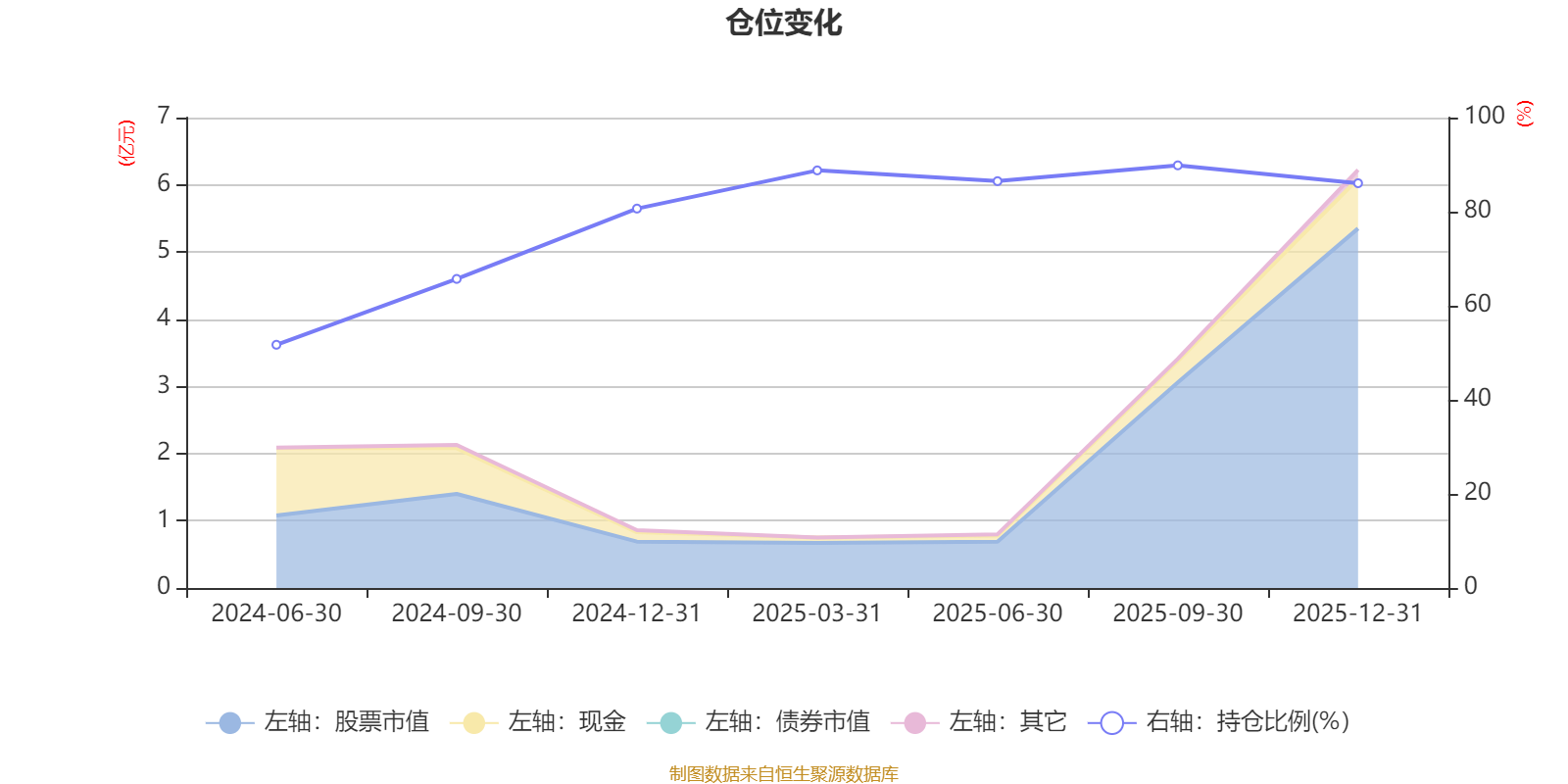 據(jù)定期報(bào)告數(shù)據(jù)統(tǒng)計(jì),成立以來平均股票倉位為78.46%,同類平均為86.9%。2025年三季度末基金達(dá)到89.85%的最高倉位,2024年上半年末最低,為51.71%。