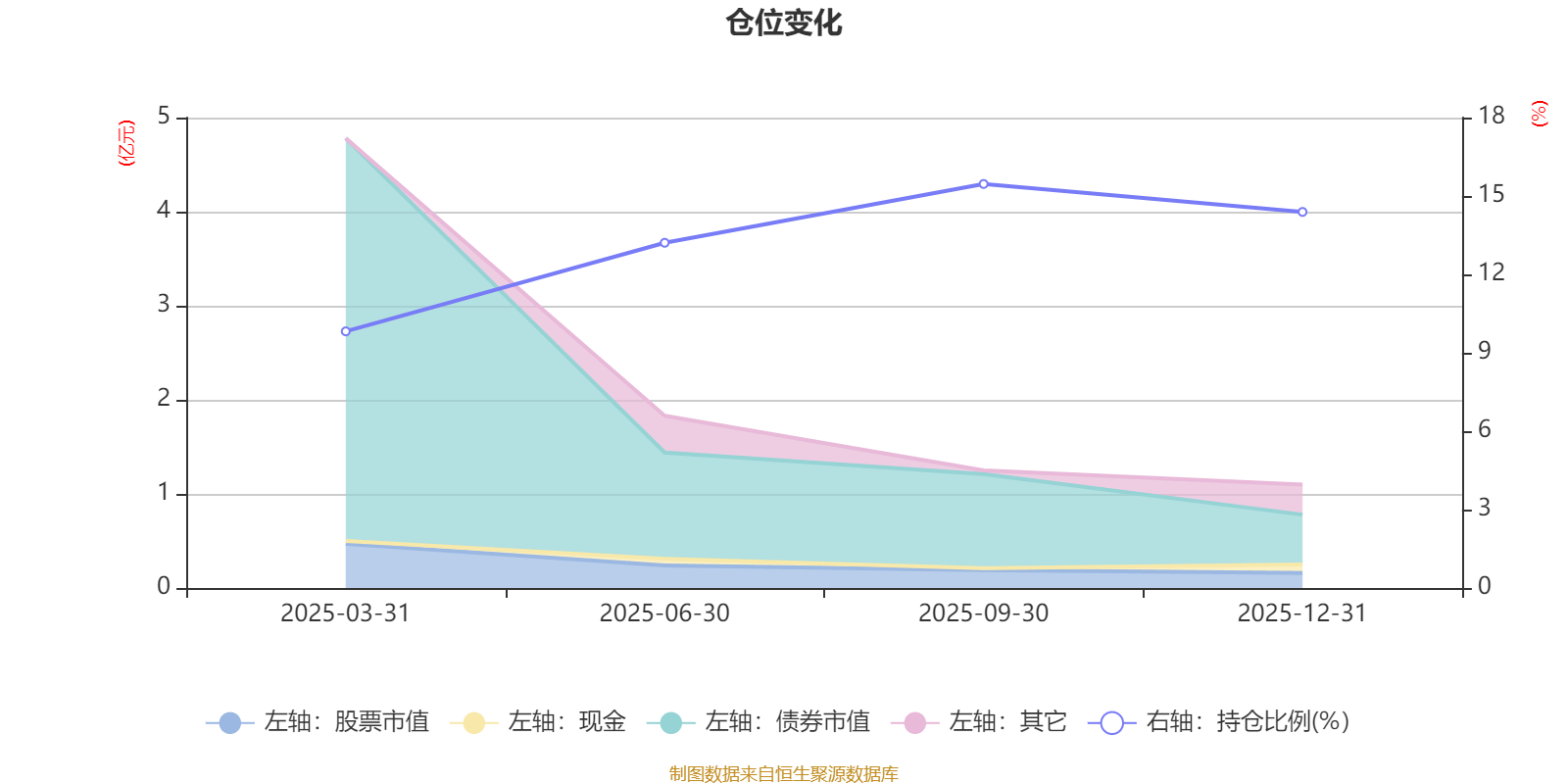據(jù)定期報(bào)告數(shù)據(jù)統(tǒng)計(jì),成立以來平均股票倉位為13.22%,同類平均為19.2%。2025年三季度末基金達(dá)到15.46%的最高倉位,2025年一季度末最低,為9.82%。