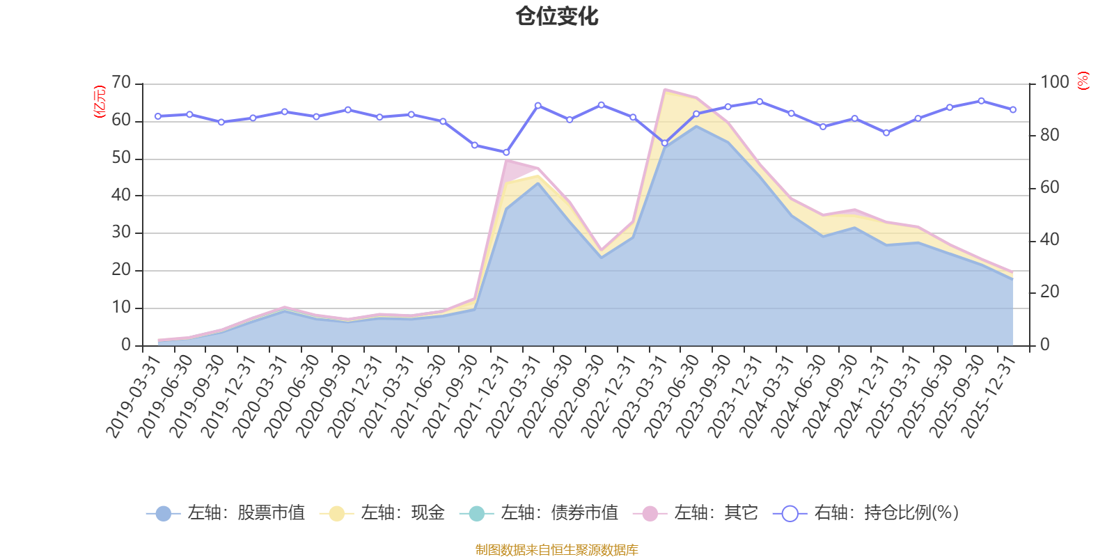 據(jù)定期報告數(shù)據(jù)統(tǒng)計,近三年平均股票倉位為87.6%,同類平均為87.64%。2025年三季度末基金達到93.4%的最高倉位,2021年末最低,為73.76%。