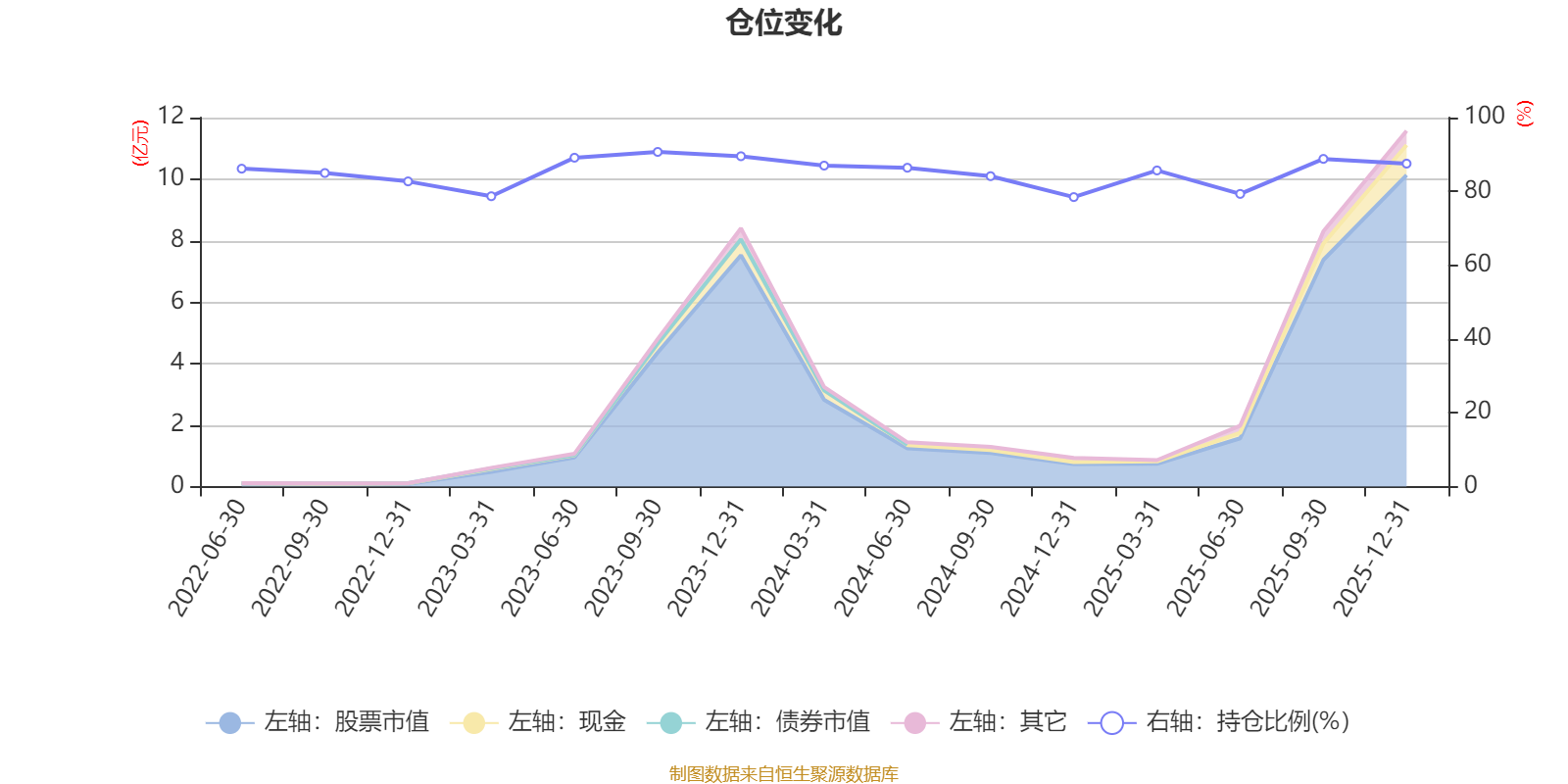據(jù)定期報告數(shù)據(jù)統(tǒng)計,近三年平均股票倉位為85.45%,同類平均為85.83%。2023年三季度末基金達到90.7%的最高倉位,2024年末最低,為78.46%。