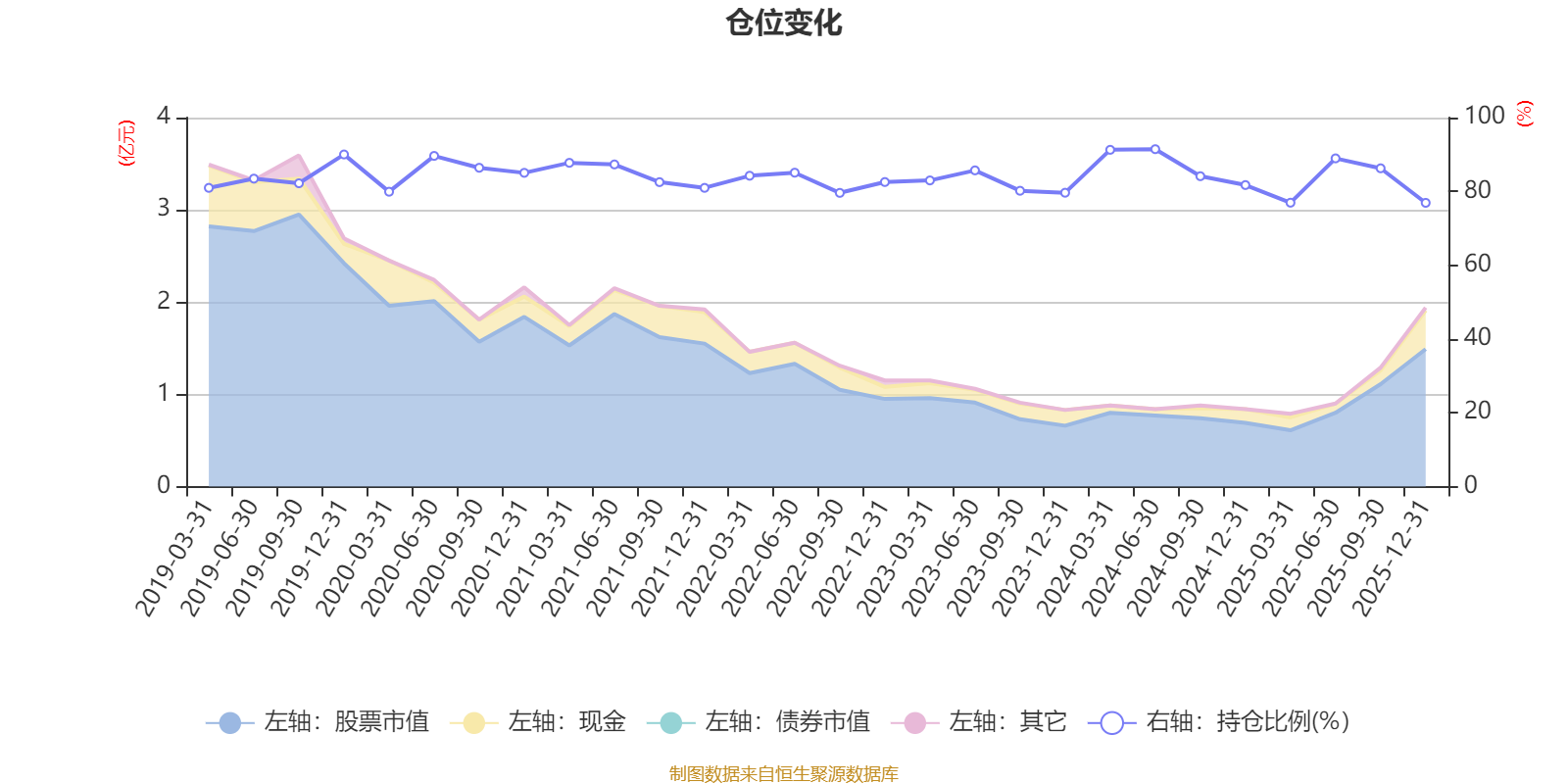 據定期報告數據統計,近三年平均股票倉位為83.84%,同類平均為72.57%。2024年上半年末基金達到91.44%的最高倉位,2025年末最低,為76.9%。