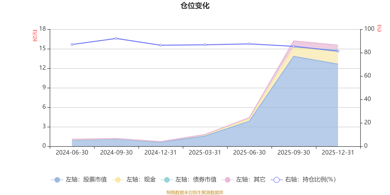 據(jù)定期報(bào)告數(shù)據(jù)統(tǒng)計(jì),成立以來(lái)平均股票倉(cāng)位為86.62%,同類(lèi)平均為85.83%。2024年三季度末基金達(dá)到92.14%的最高倉(cāng)位,2025年末最低,為81.24%。