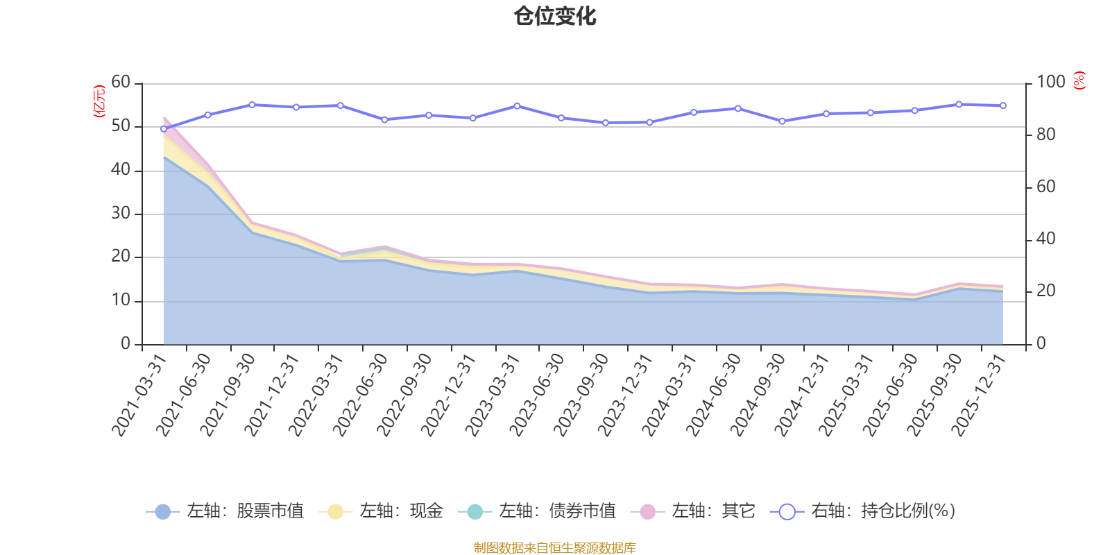 據(jù)定期報(bào)告數(shù)據(jù)統(tǒng)計(jì),近三年平均股票倉位為88.55%,同類平均為87.64%。2025年三季度末基金達(dá)到91.9%的最高倉位,2021年一季度末最低,為82.52%。