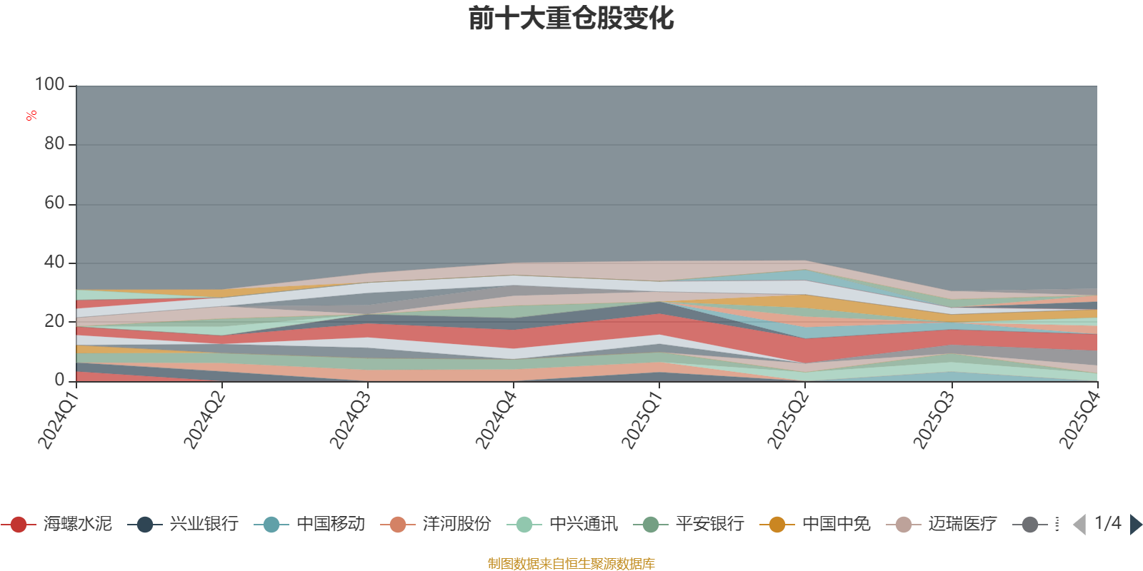 截至2025年四季度末,基金十大重倉(cāng)股分別是貴州茅臺(tái)、美團(tuán)-W、海康威視、順豐控股、海爾智家、中興通訊、邁瑞醫(yī)療、公牛集團(tuán)、招商公路、分眾傳媒。