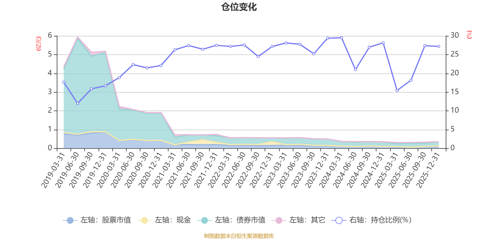 據(jù)定期報告數(shù)據(jù)統(tǒng)計,近三年平均股票倉位為25.35%,同類平均為19.2%。2024年一季度末基金達(dá)到29.51%的最高倉位,2019年上半年末最低,為11.98%。