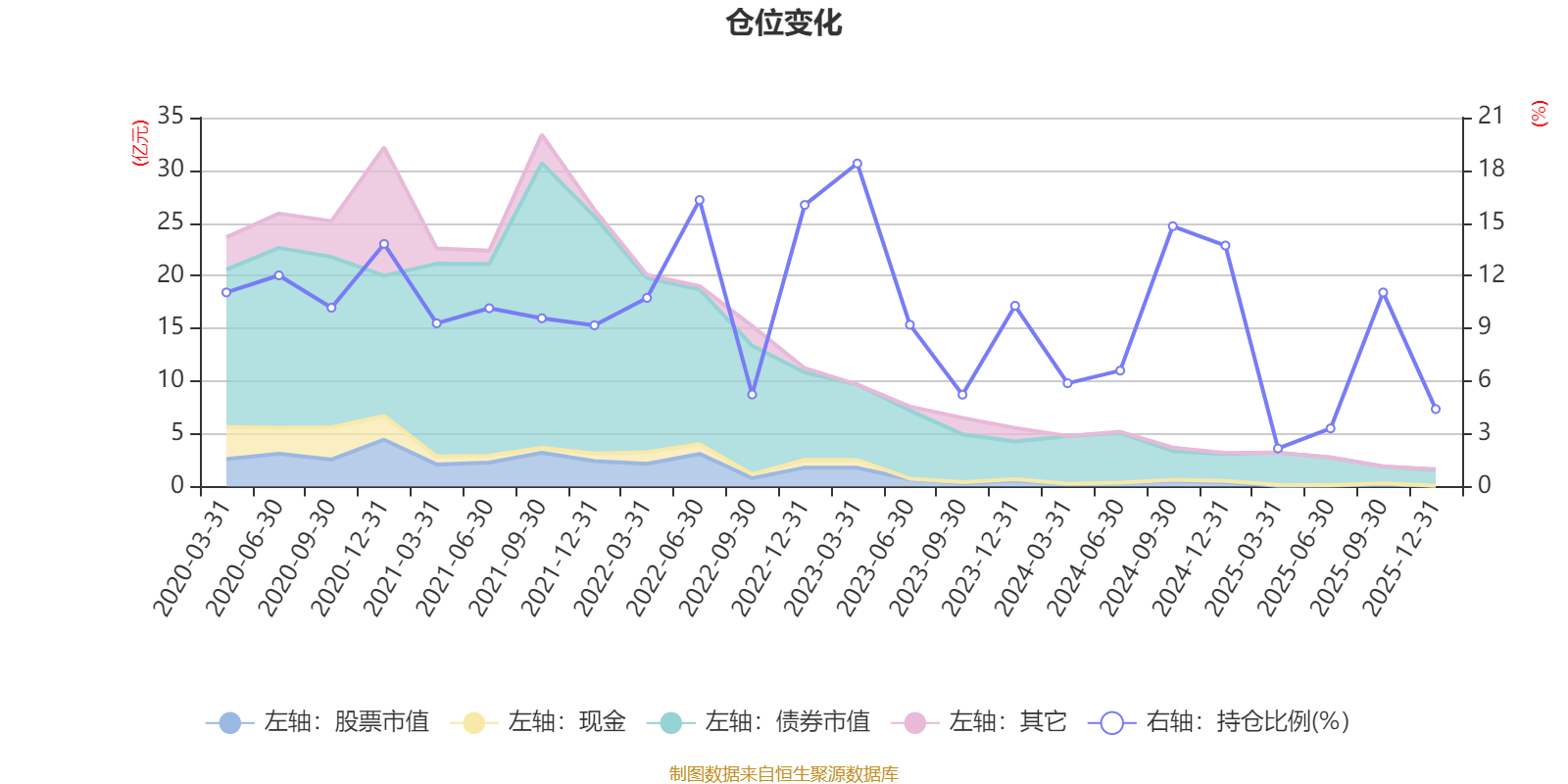 據(jù)定期報(bào)告數(shù)據(jù)統(tǒng)計(jì),近三年平均股票倉位為8.76%,同類平均為19.2%。2023年一季度末基金達(dá)到18.39%的最高倉位,2025年一季度末最低,為2.17%。