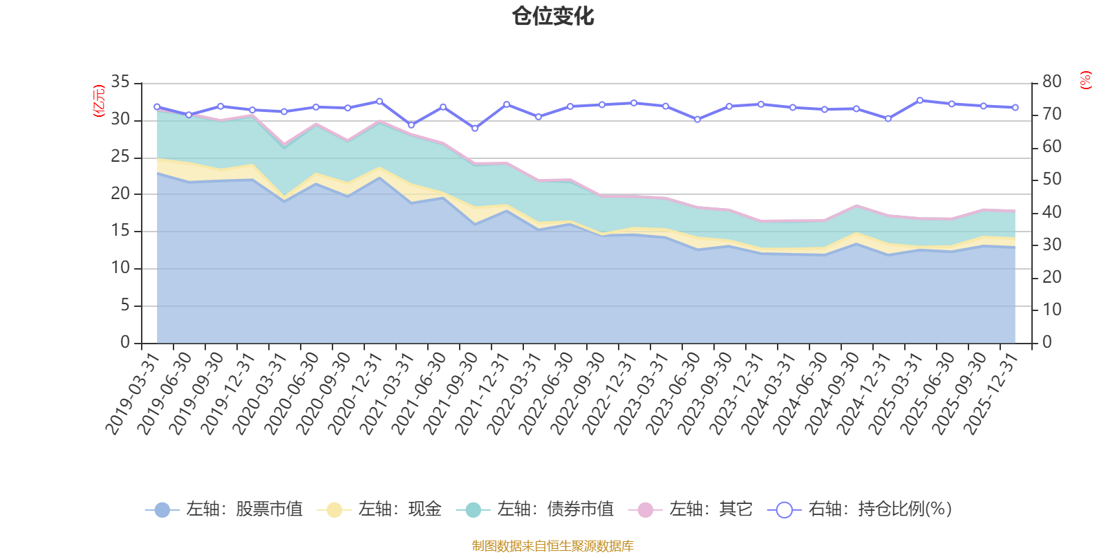 據(jù)定期報告數(shù)據(jù)統(tǒng)計,近三年平均股票倉位為72.25%,同類平均為72.57%。2025年一季度末基金達到74.65%的最高倉位,2021年三季度末最低,為66.05%。