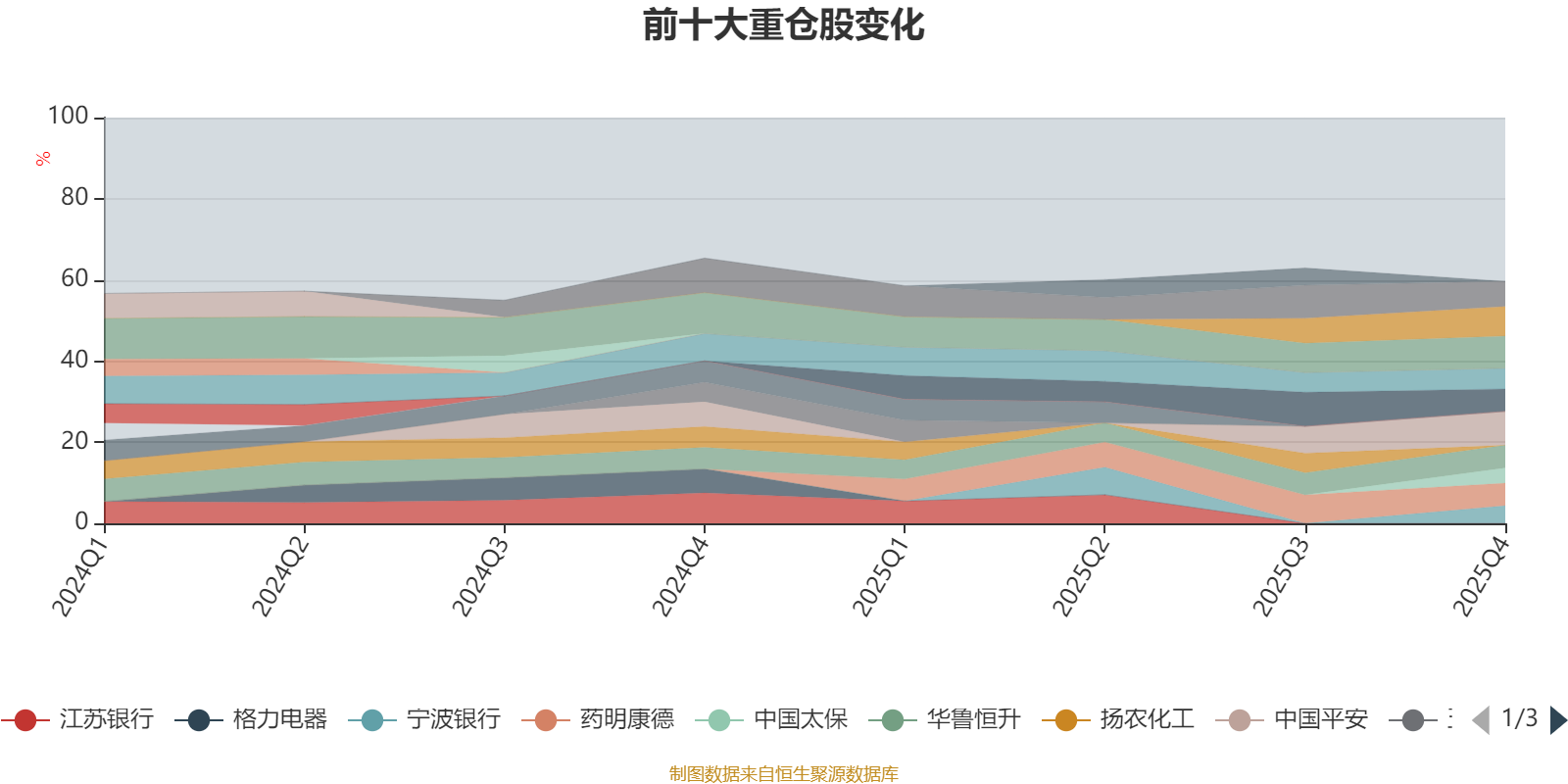 該基金持股集中度較高。截至2025年四季度末,基金十大重倉股分別是中國平安、美的集團、紫金礦業(yè)、寧德時代、華魯恒升、藥明康德、立訊精密、招商銀行、寧波銀行、中國太保。