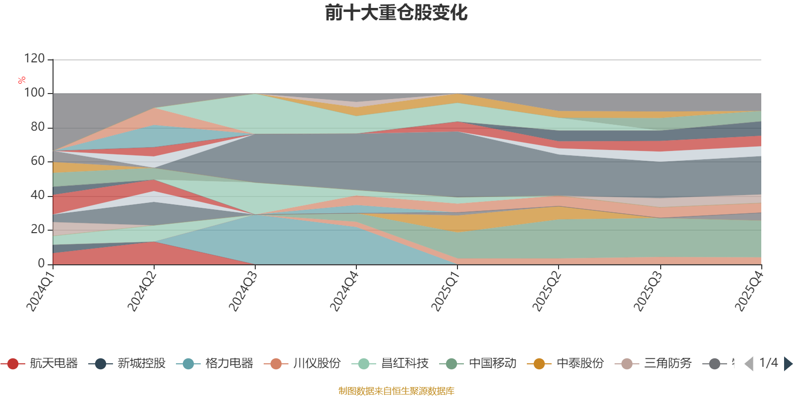 該基金持股集中度較高,近2年前十大重倉股集中度長(zhǎng)期超過60%。截至2025年四季度末,基金十大重倉股分別是美的集團(tuán)、中國移動(dòng)、思源電氣、齊魯銀行、東方電纜、渝農(nóng)商行、廣日股份、安徽合力、特變電工、川儀股份。